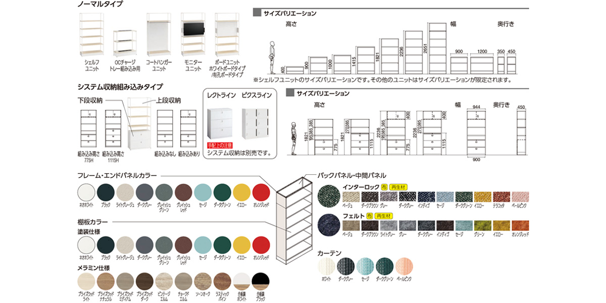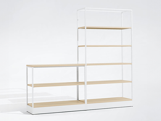 シェルフユニットにはカウンターとして使える1000Hや、ベンチとして使える400Hを品揃え。1台ずつ配置していく構成のためレイアウトも簡単です。