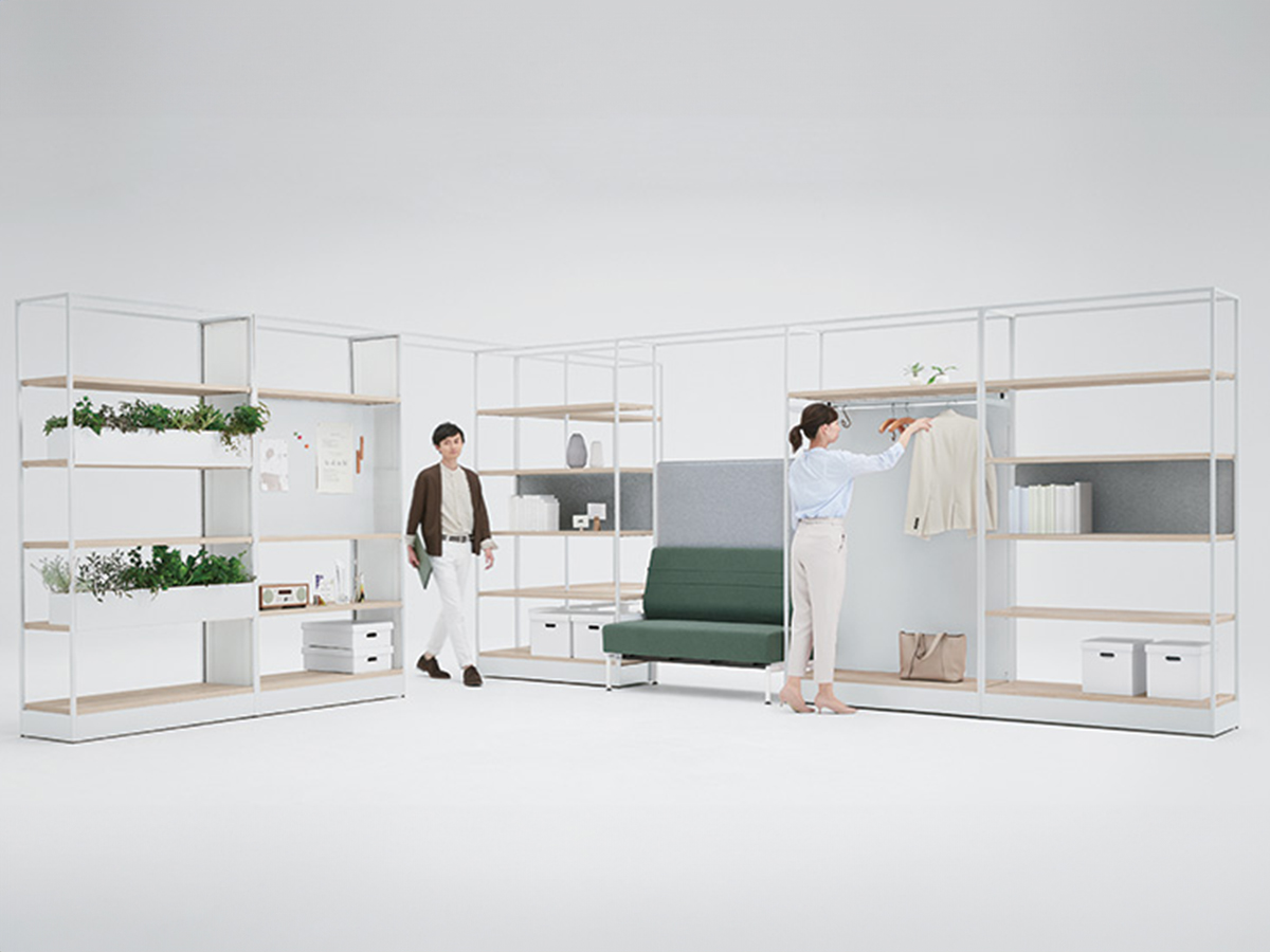 作業をしながらもコミュニケーションが取りやすいよう、900Hのシェルフユニットはライブスユニットソファと組み合わせやすい高さです。