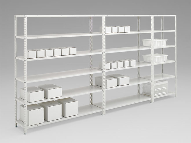 棚板1段あたり150kgの軽量棚。独立構造でレイアウト変更が容易。