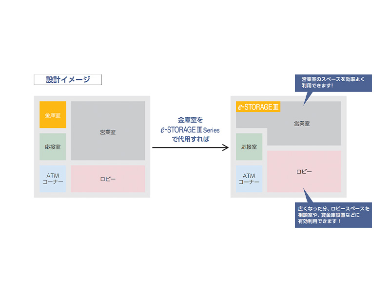 金融店舗形態の多様化、店舗内における重要物の減少などの背景から、金庫室レス店舗は増加傾向です。e-STORAGEⅢで金庫室レス化を実現し、店舗のスペースをより効率的に利用して最適な店舗空間をご提案いたします。