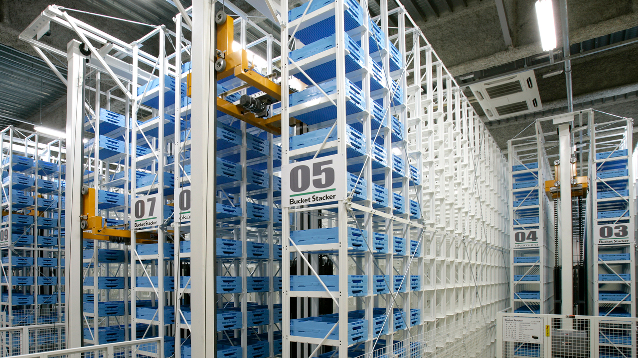 多品種管理を行う定型バケット用の自動倉庫。オカムラ独自技術による省エネ高速入出庫を実現。