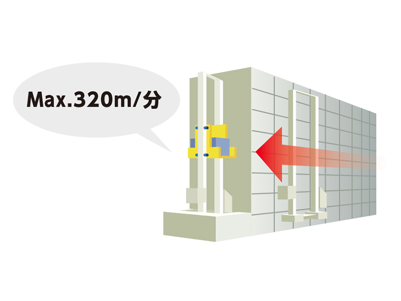 スタッカークレーンは、独自の速度コントロールとメカニズムで高速性能アップ。走行スピードは最大毎分320mを実現(高速タイプ)。走行と昇降のタイミングを最適に保つための同時到着制御を採用、省エネ効果もあり無理のない高速入出庫を行います。
