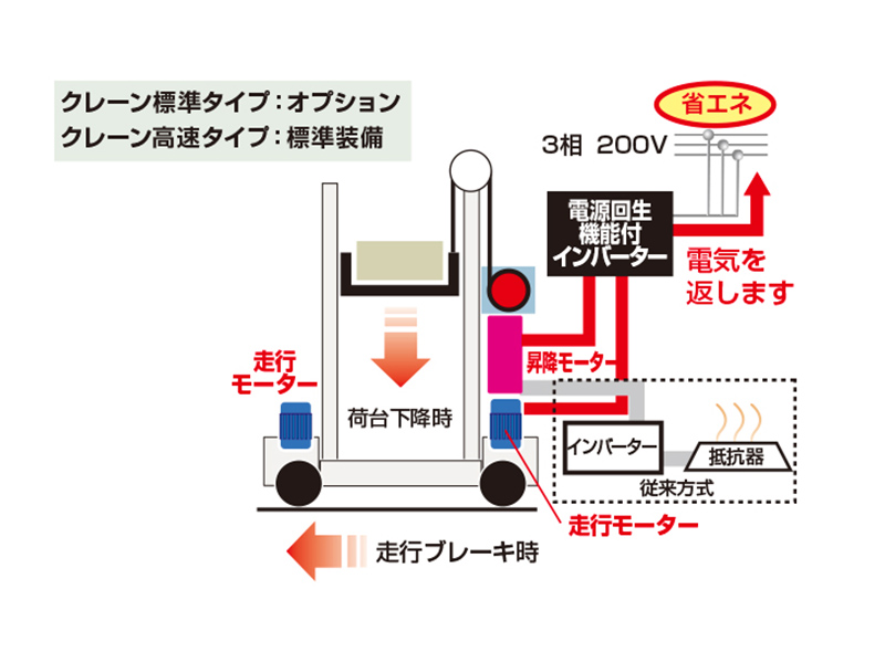 クレーン動作のモーター減速時(走行ブレーキ、荷台下降)に発電された回生電流を電源として返還する「電源回生制御」を採用し、省エネルギー化を実現しています。