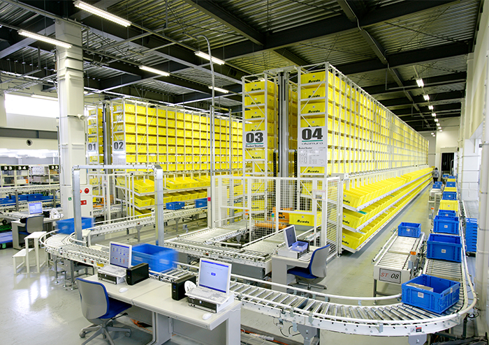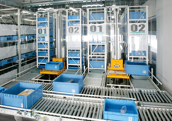 スタッカークレーンは、独自の速度コントロールとメカニズムで走行スピード最大毎分320 mを実現(高速タイプ)。走行と昇降のタイミングを最適に保つための同時到着制御を採用、省エネ効果もあり無理のない高速入出庫を行います