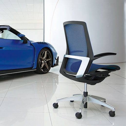 背からすっと伸びる美しいアーム、背から座下へと流れるフレームライン。研ぎ澄まされ、まるで風を切るかのよう に薄く軽やかなデザイン。