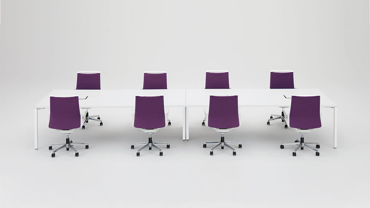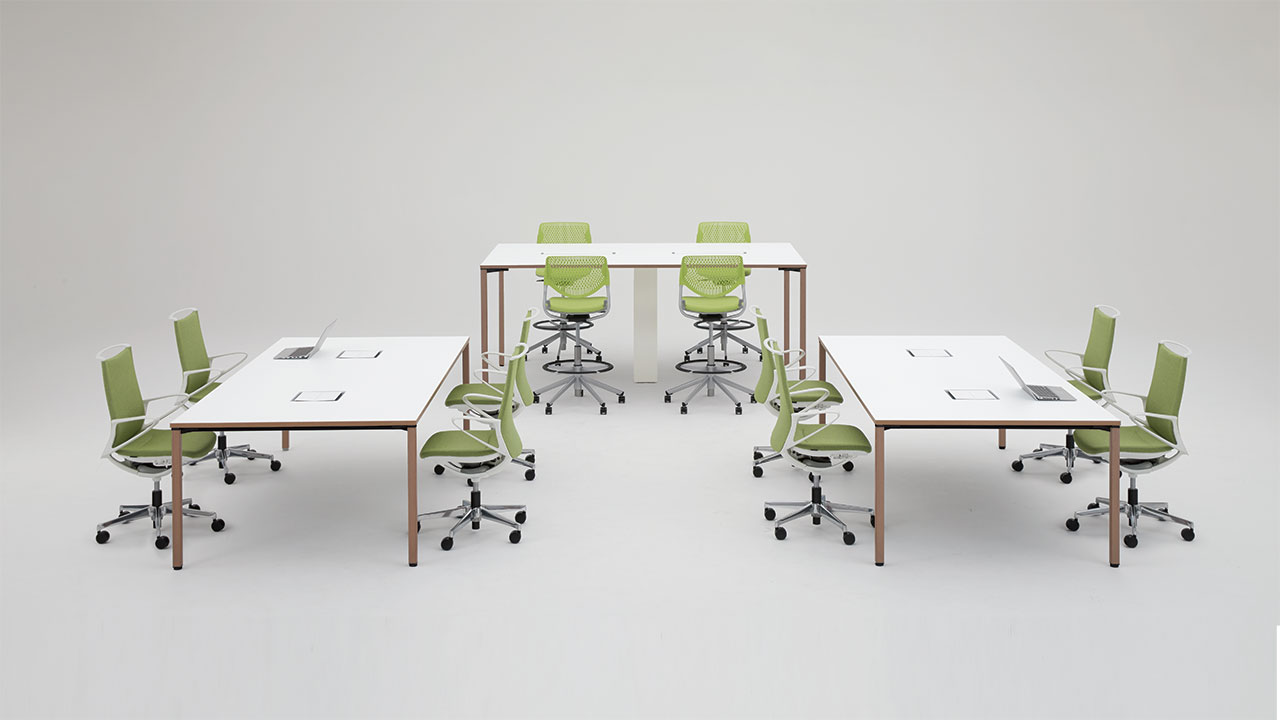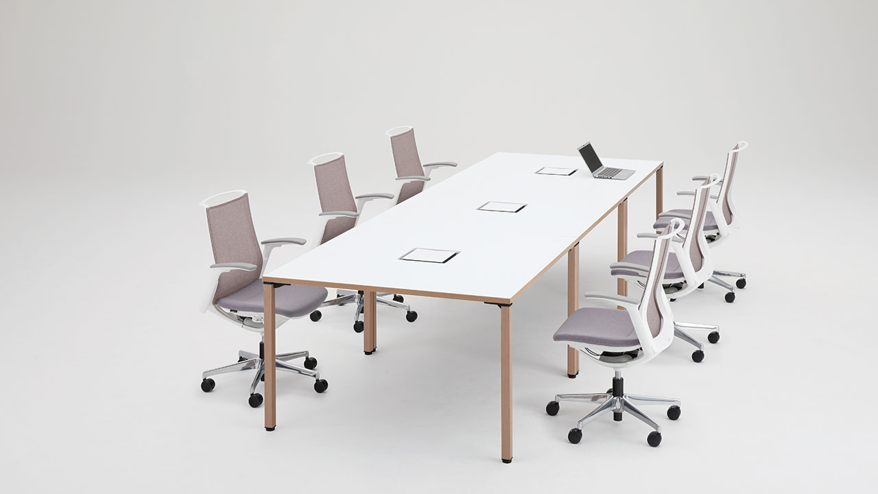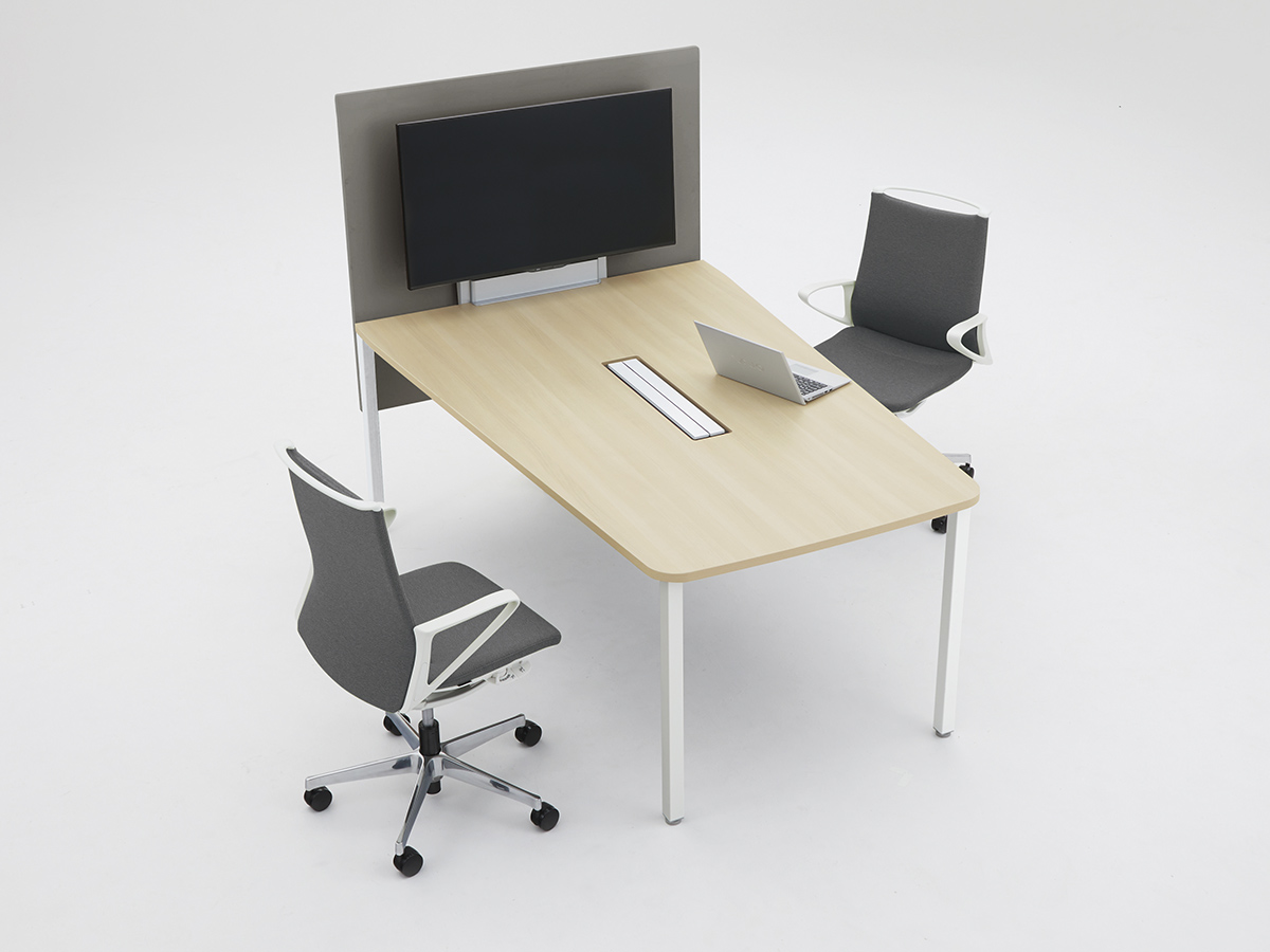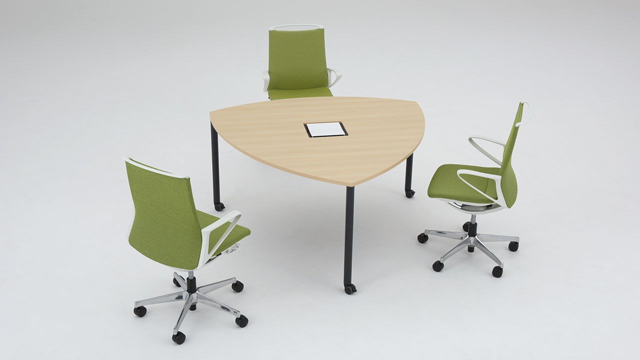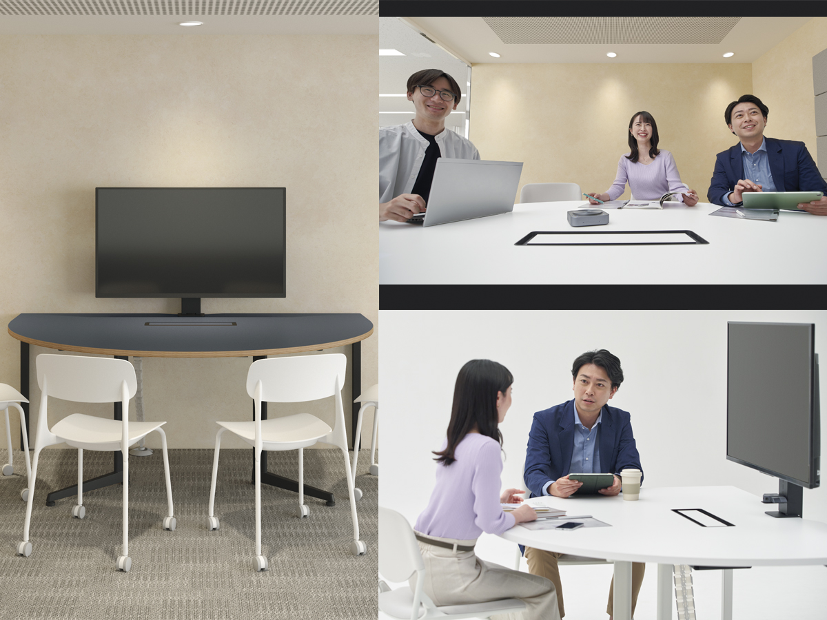 半円形状なので、対面でもオンラインでも、参加者全員の顔を見渡しやすく、ハイブリッド会議におすすめです。1on1テーブルとしてもお使いいただけます。