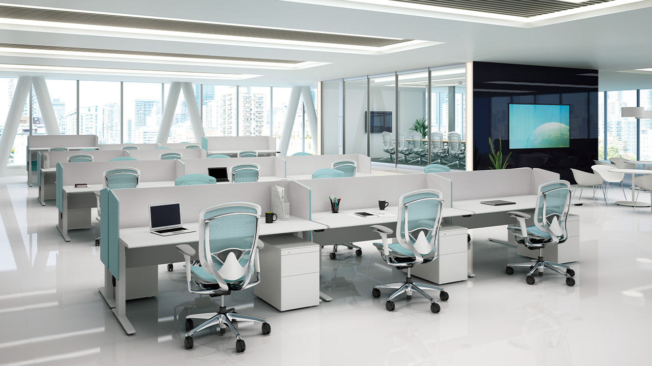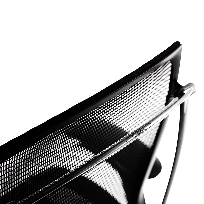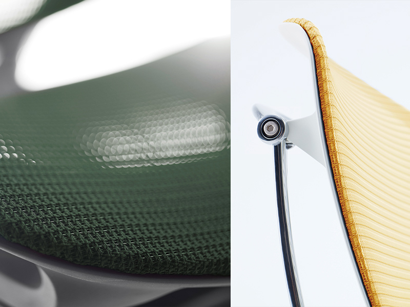 Contessaから培われてきたオカムラ独自のメッシュ技術。Contessa Ⅱでは、より透過性が高く、軽やかさを演出する「背メッシュ」と、手触りの良い糸を縦横両方に組み合わせ、どの方向から触れても心地よい「座メッシュ」を新たに開発。メッシュカラーはトレンドに合わせてトーンと色相をリニューアルしました。