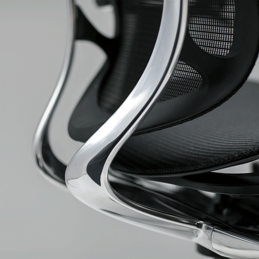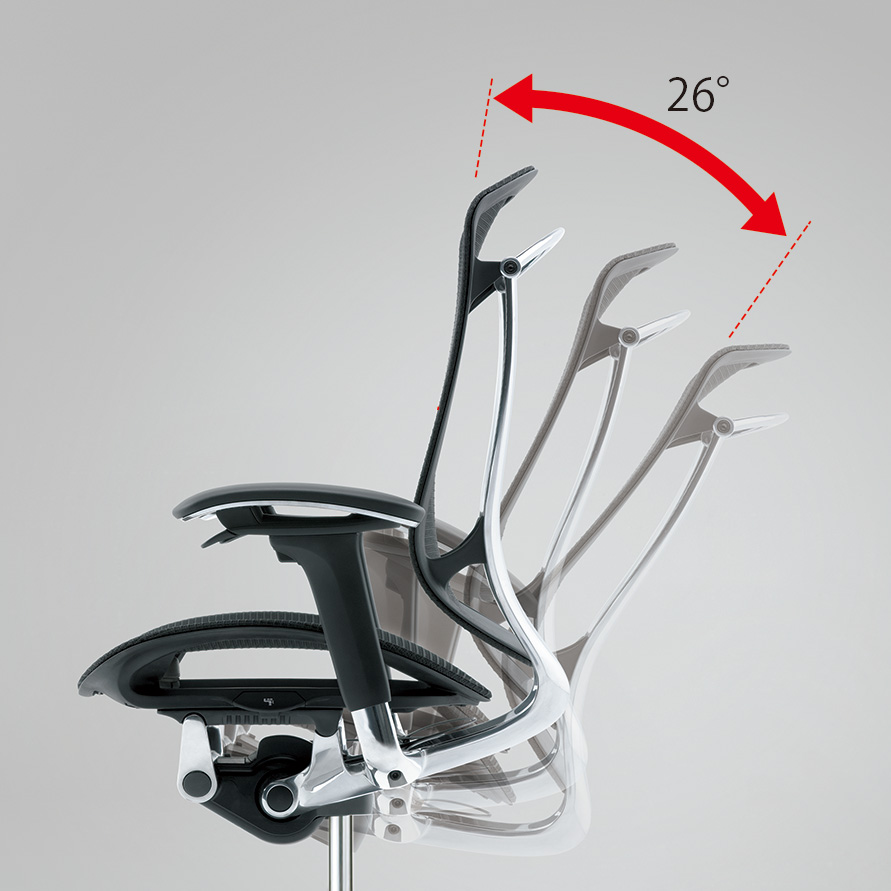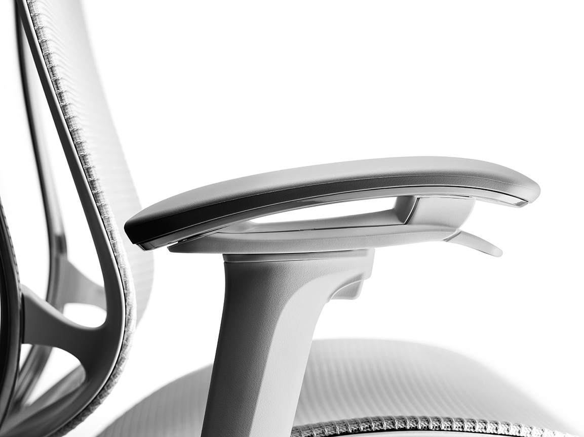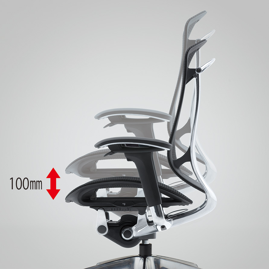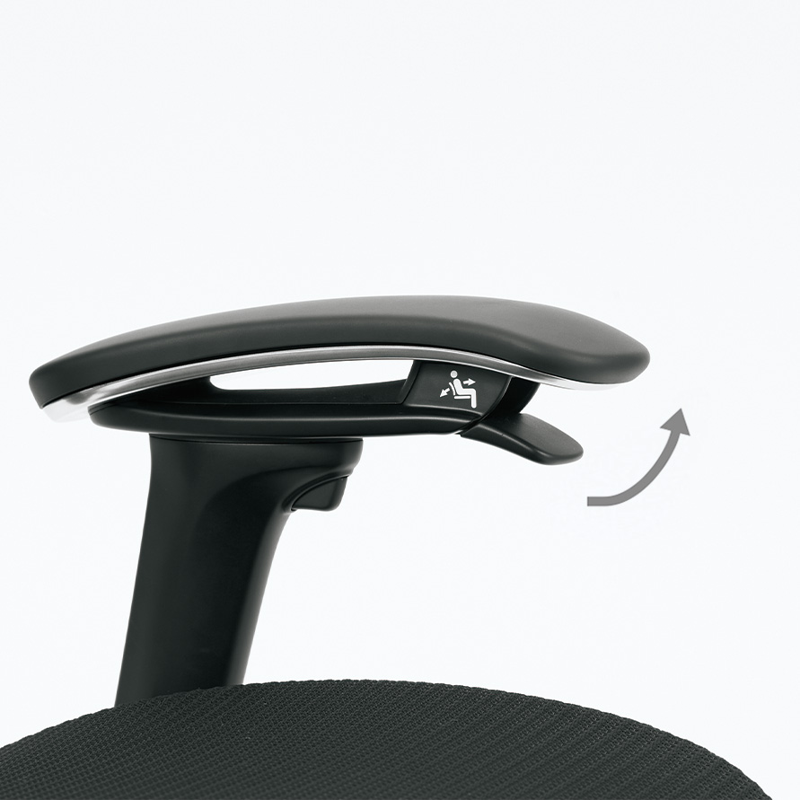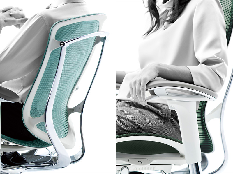背フレームは薄さをより追求し、座フレームは柔軟性が向上しました。また、クッションタイプには異硬度クッションを採用し、より上質な座り心地を提供します。様々な体格や姿勢に対応するため、アームは自由自在に調節できます。また、リクライニングなどの姿勢変化も肘先のレバーでスマートに操作することができます。