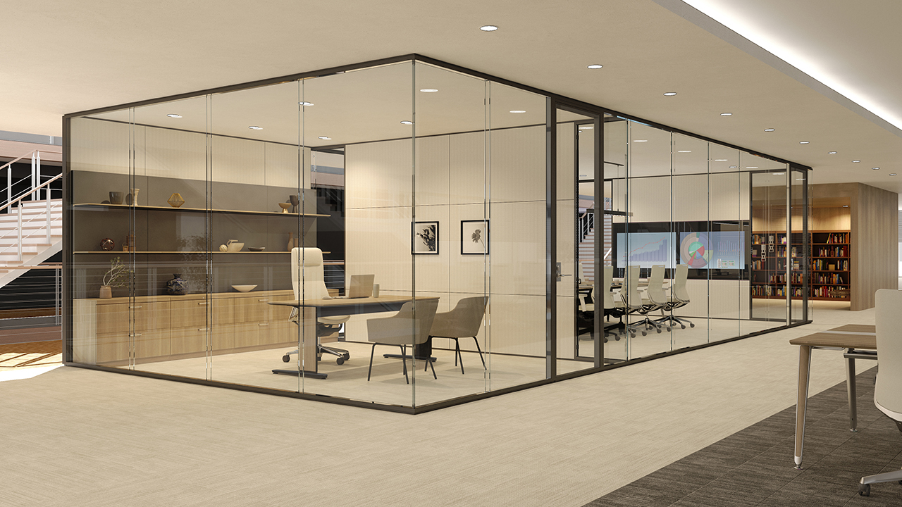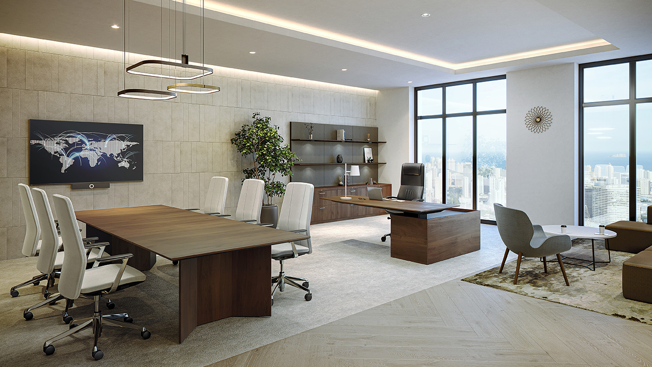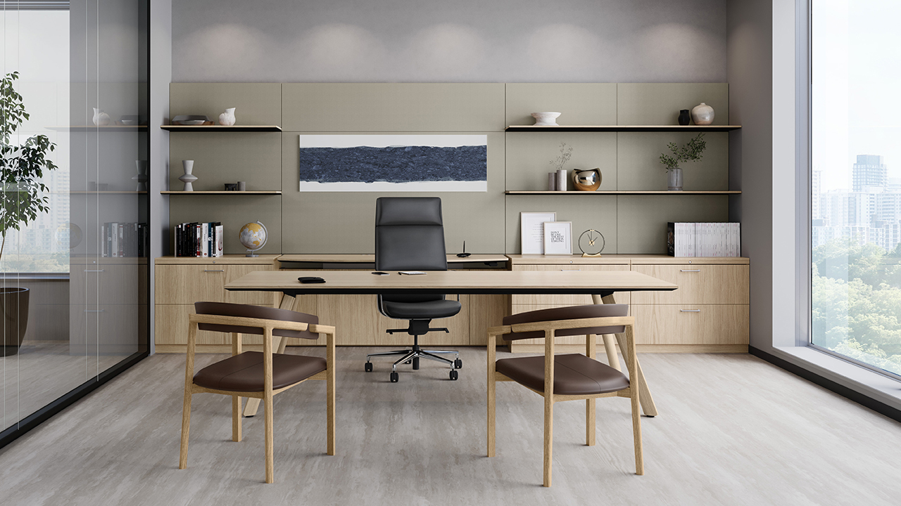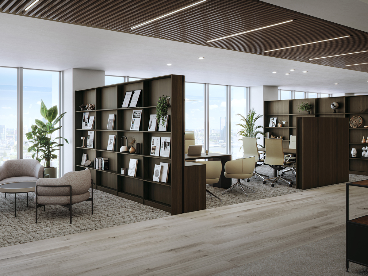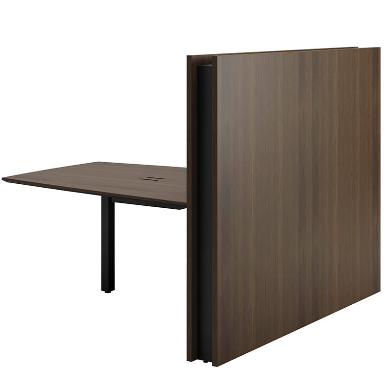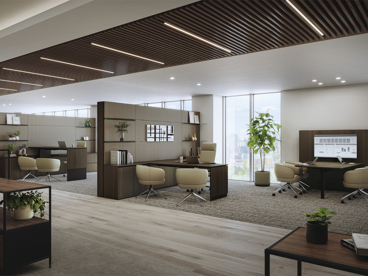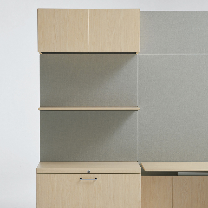 壁面ユニットに電動昇降デスクを組み込むことで、ミーティングスペースを確保しつつ、機能的に働けるエグゼクティブ個室に。エグゼクティブ個室を最小限のサイズにしたことで生まれた空間を、交流スペースとして有効活用できます。