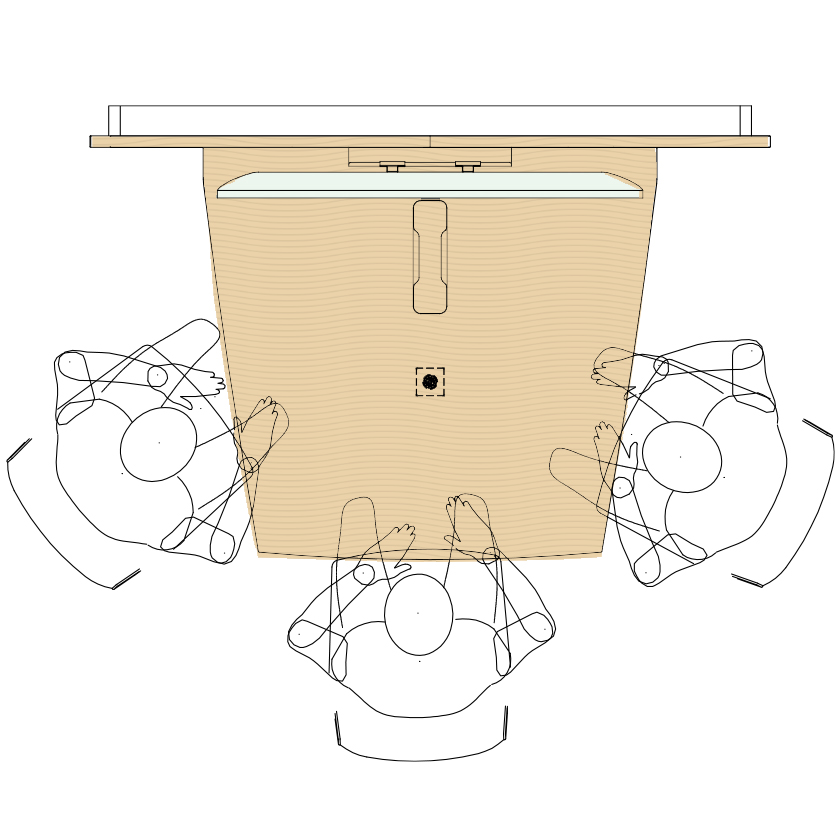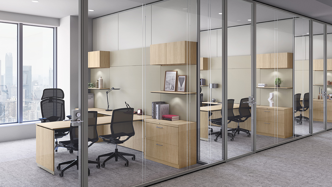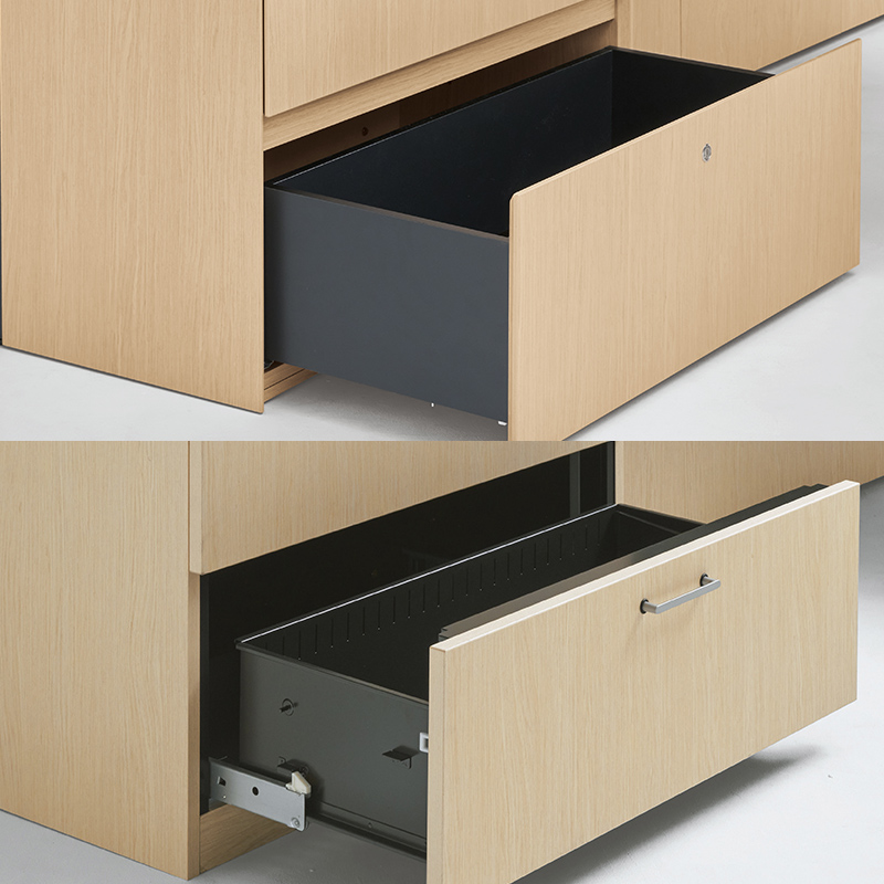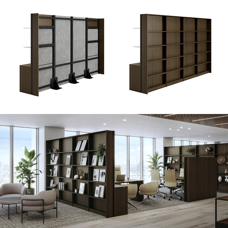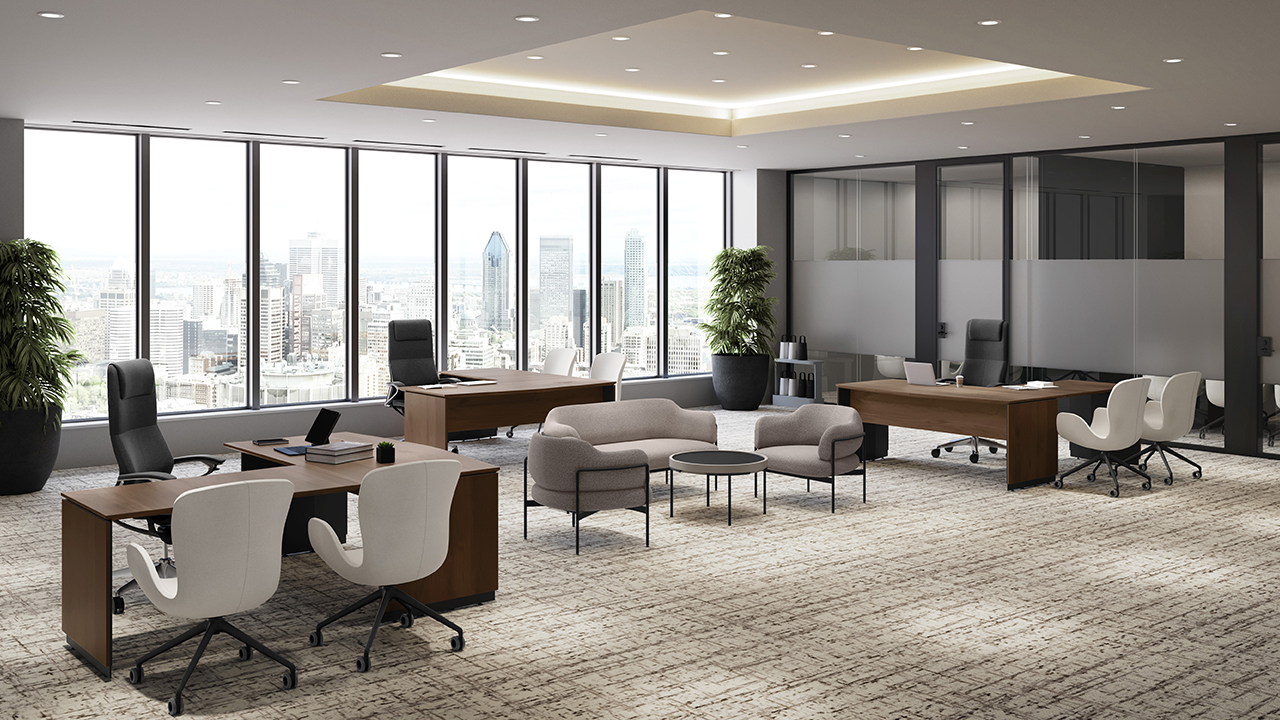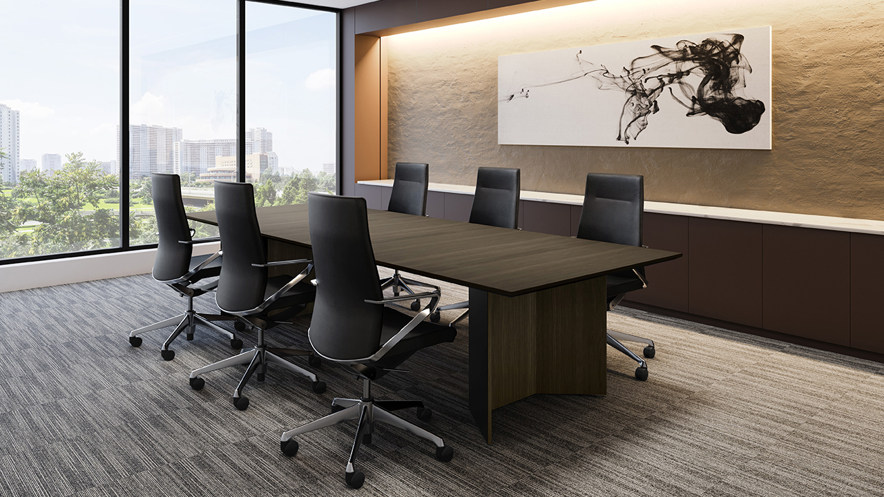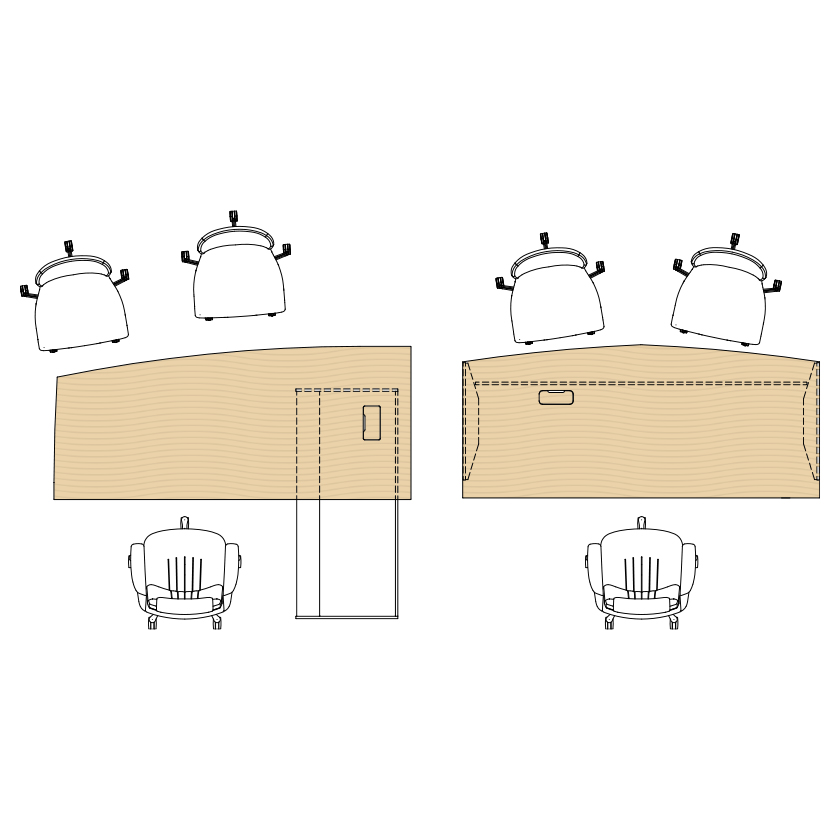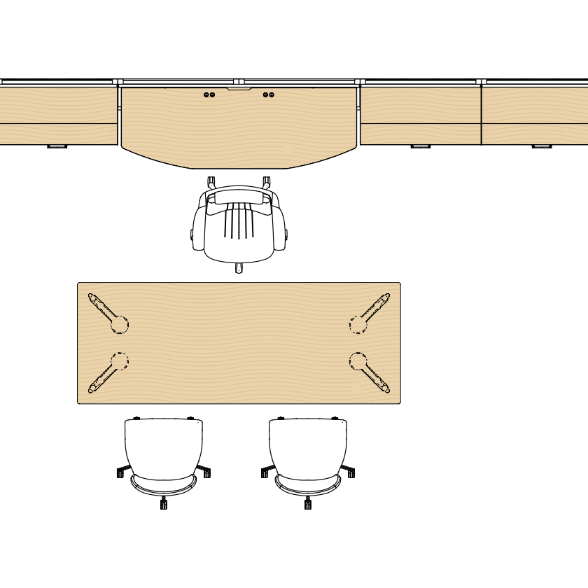 壁面ユニットに電動昇降デスクを組み込むことで、ミーティングスペースを確保しつつ、機能的に働けるエグゼクティブ個室に。エグゼクティブ個室を最小限のサイズにしたことで生まれた空間を、交流スペースとして有効活用できます。