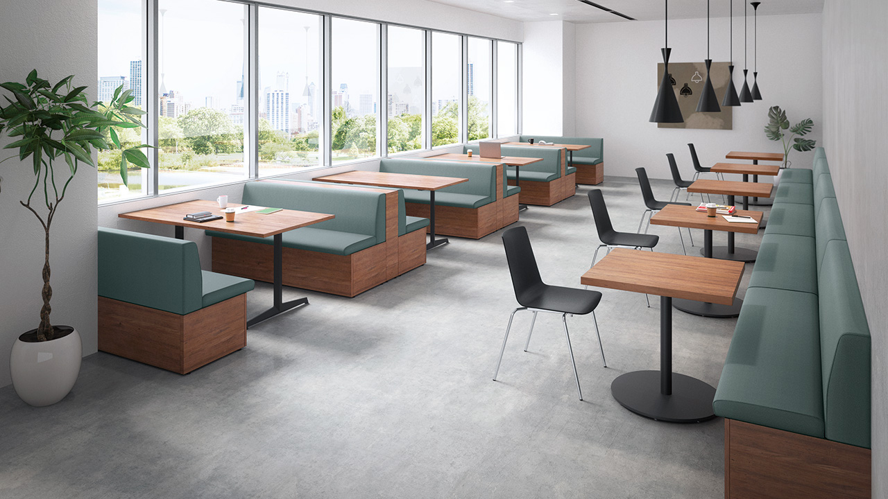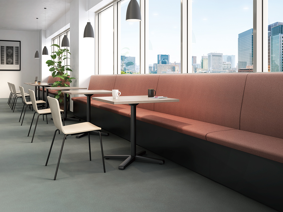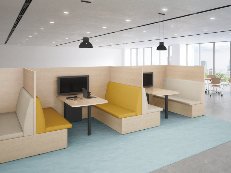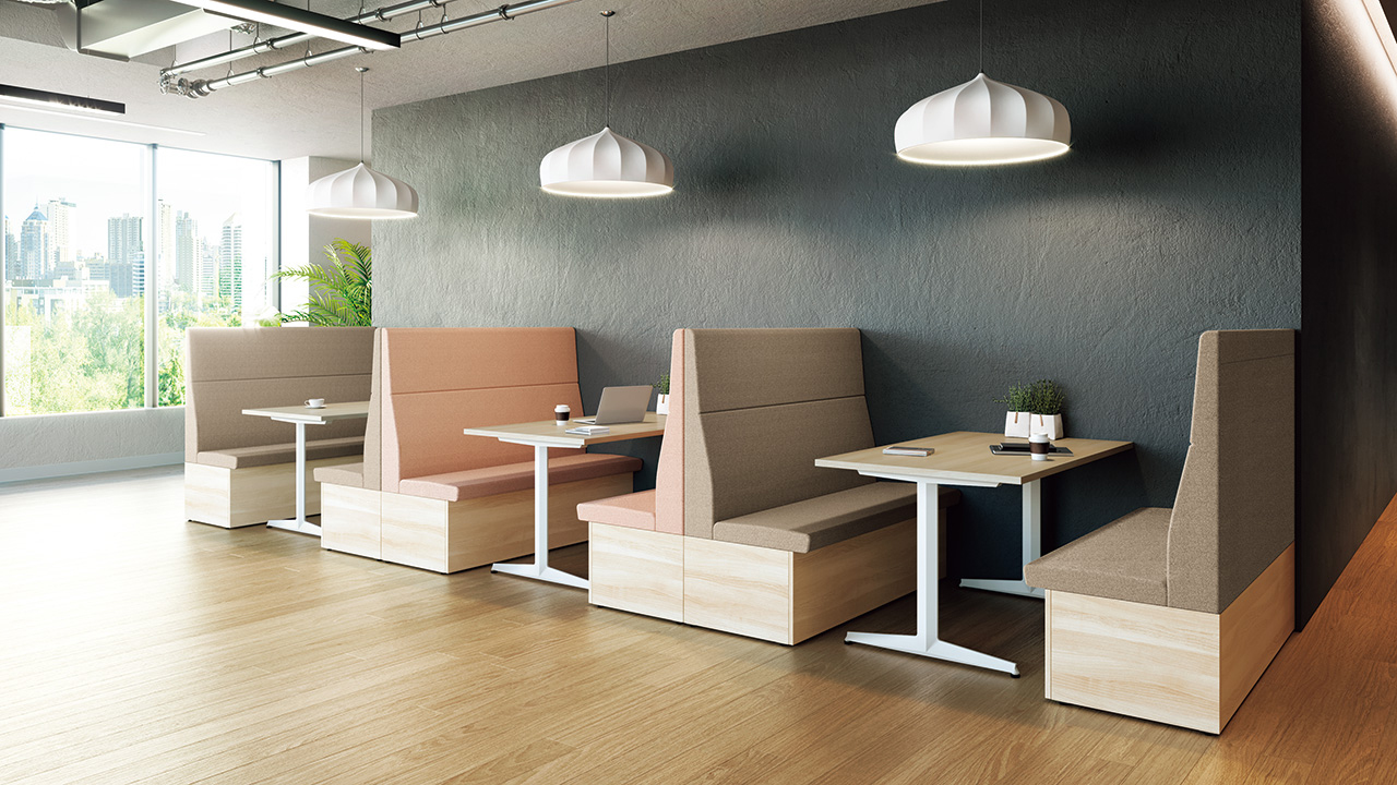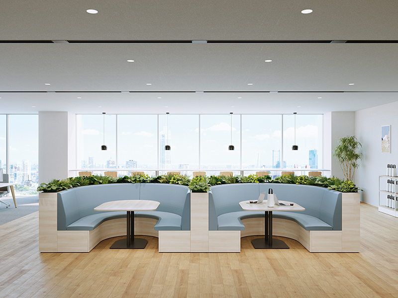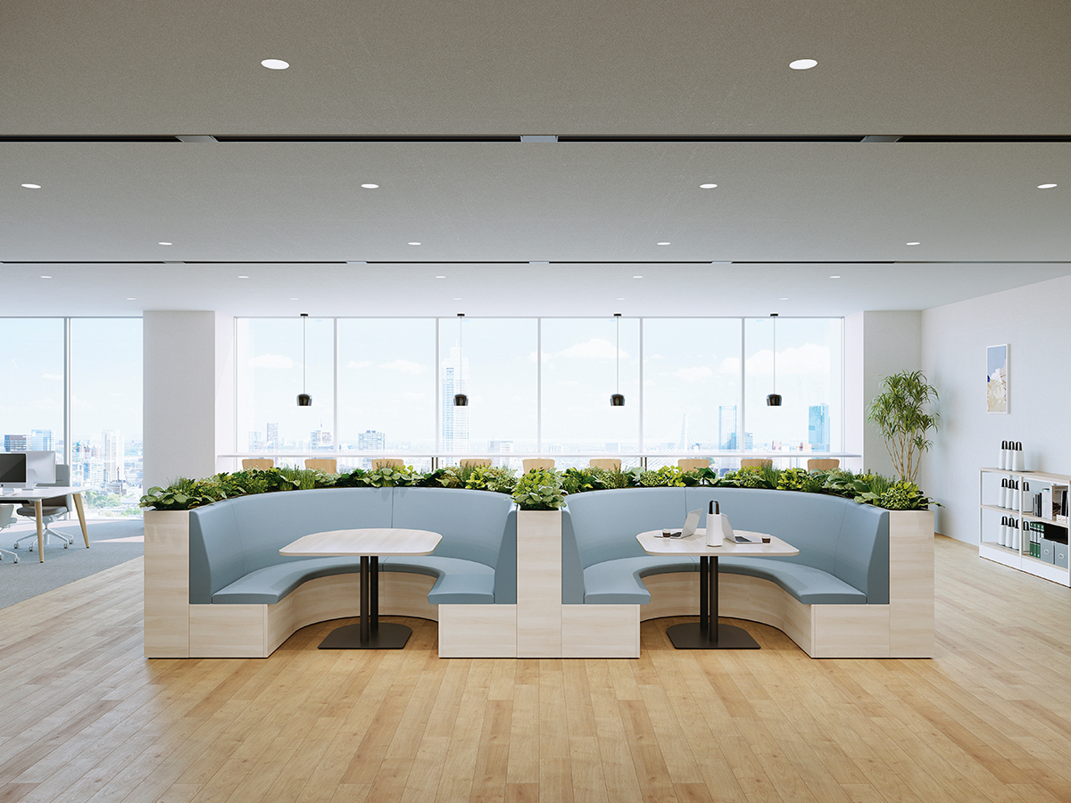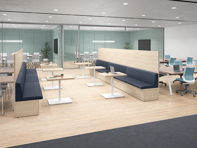 テーブルを囲むように配置することで、少人数でのミーティングが可能なレイアウト。必要に応じてソファベンチの背面にパネルやスペーサーを置くことで、周囲からの視線を遮ったり、距離をとることができます。