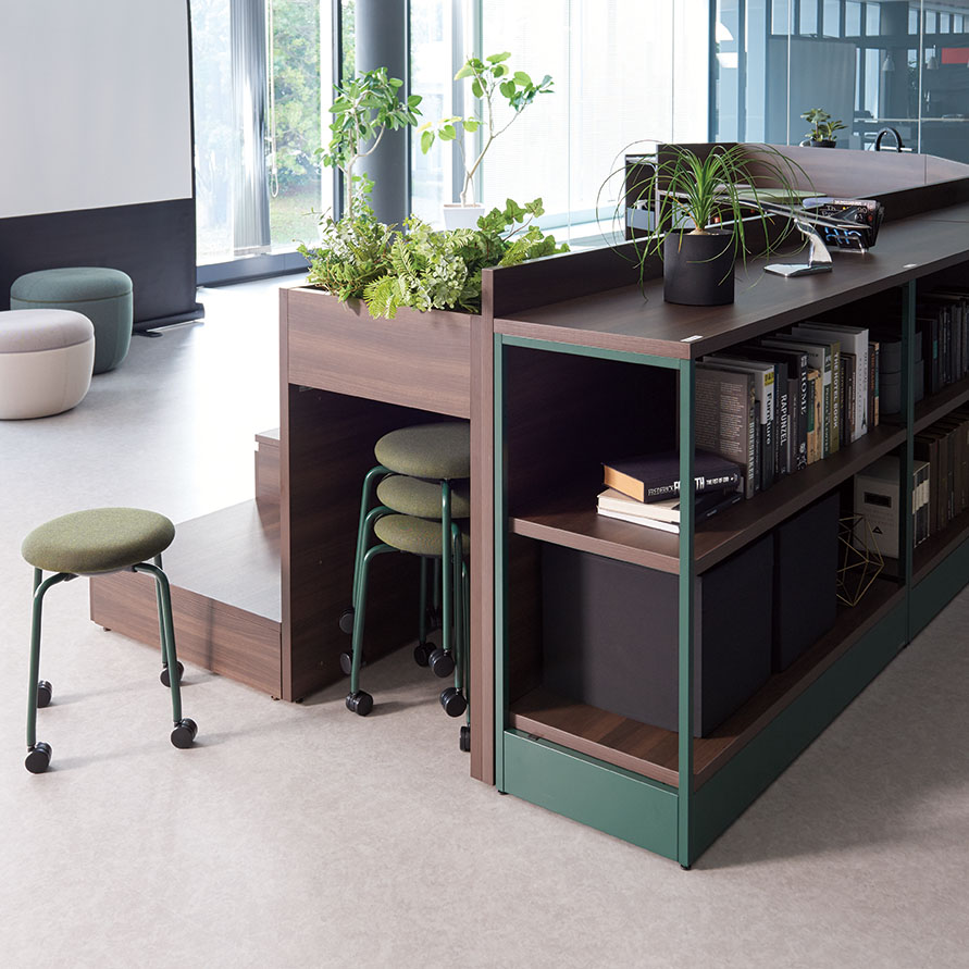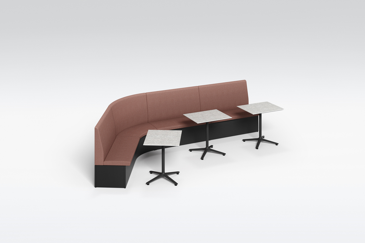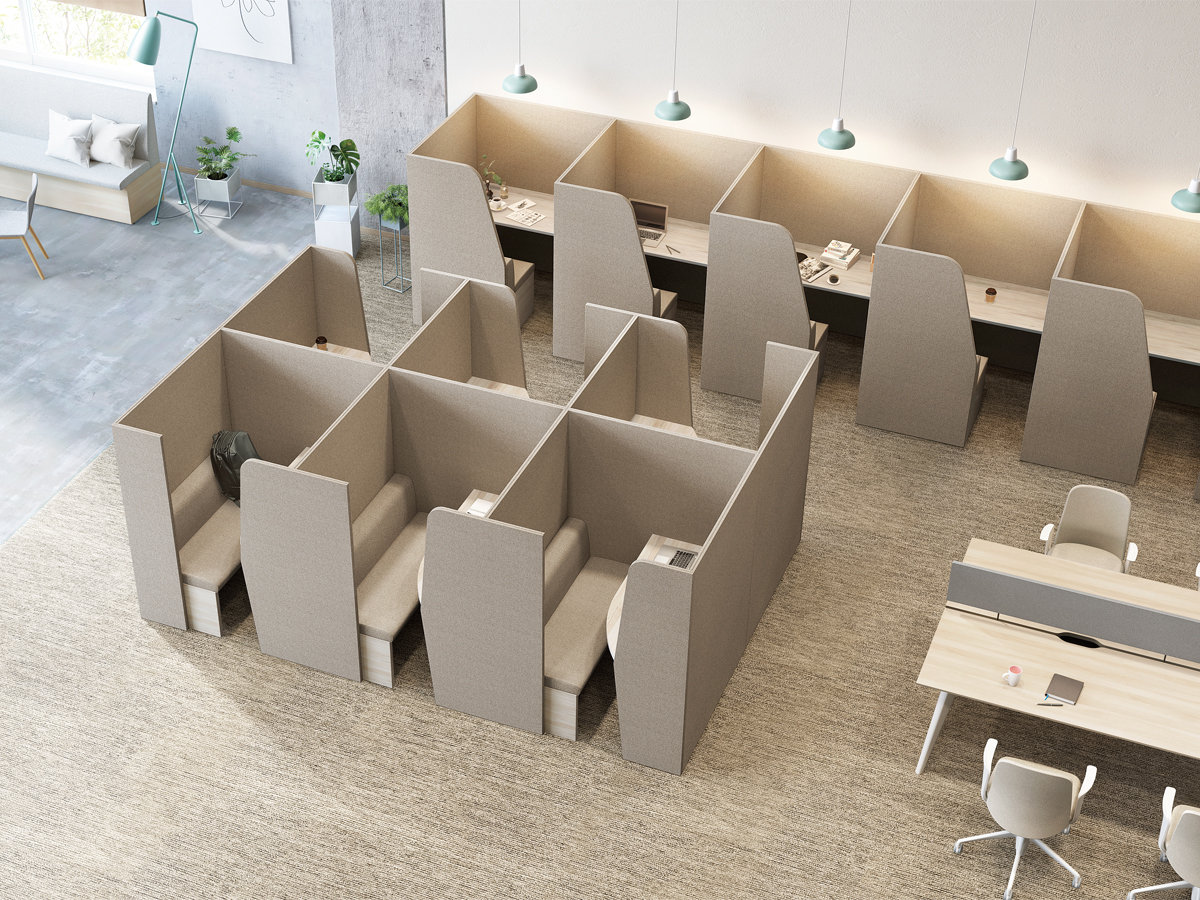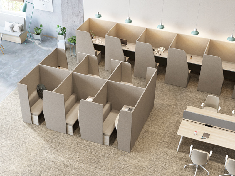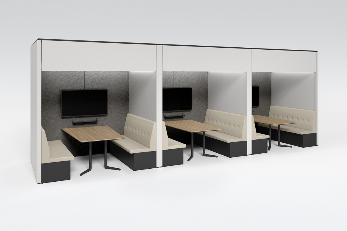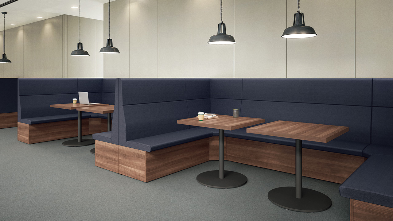 テーブルを囲むように配置することで、少人数でのミーティングが可能なレイアウト。必要に応じてソファベンチの背面にパネルやスペーサーを置くことで、周囲からの視線を遮ったり、距離をとることができます。