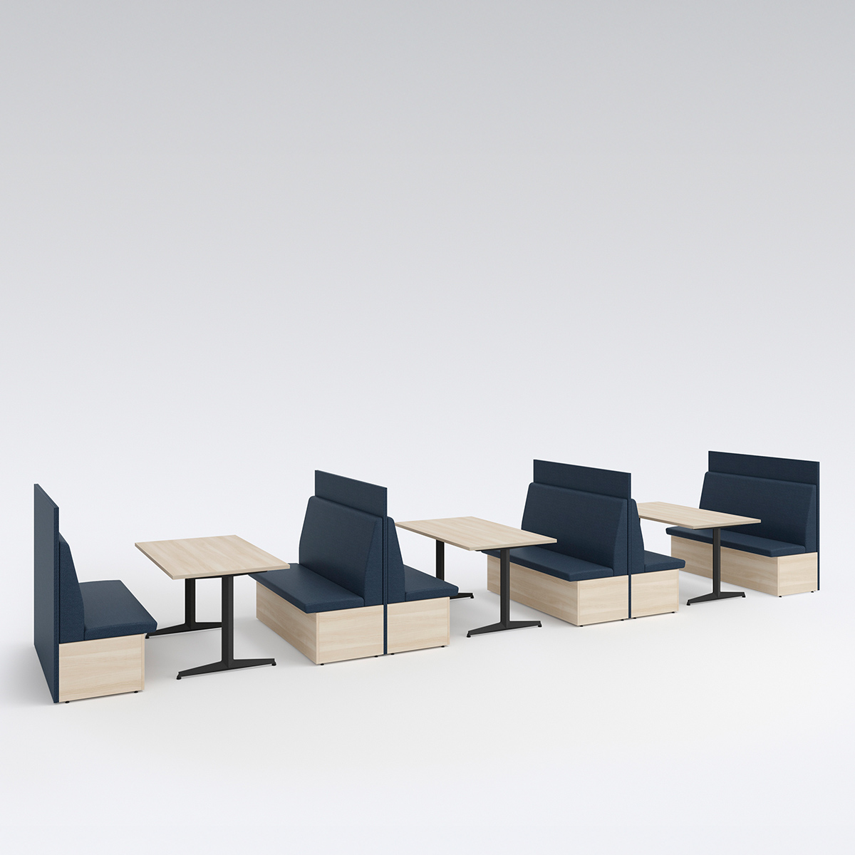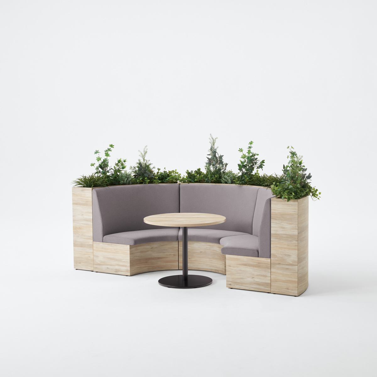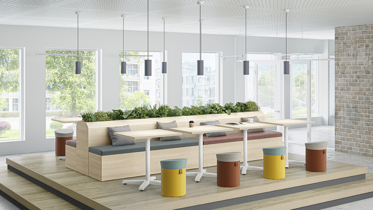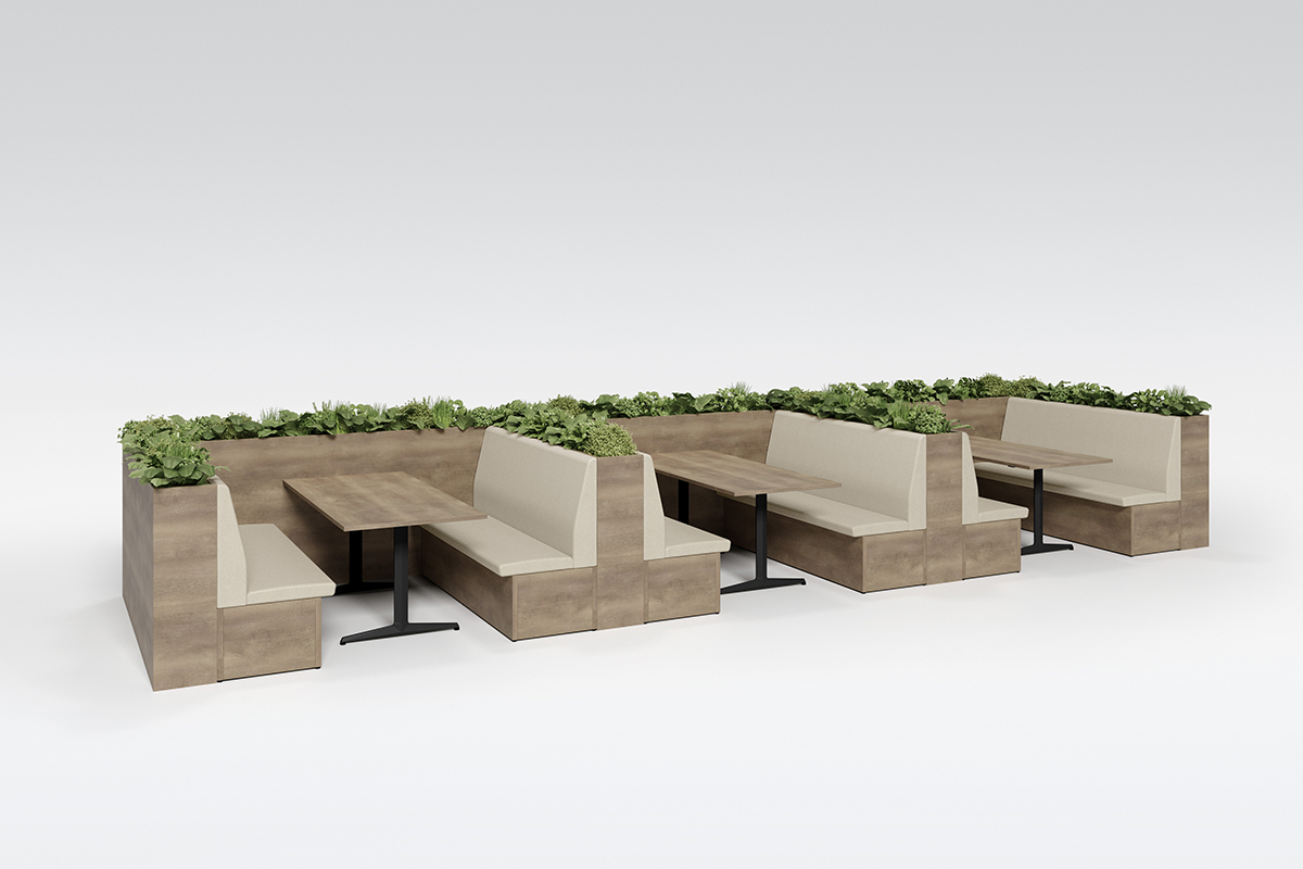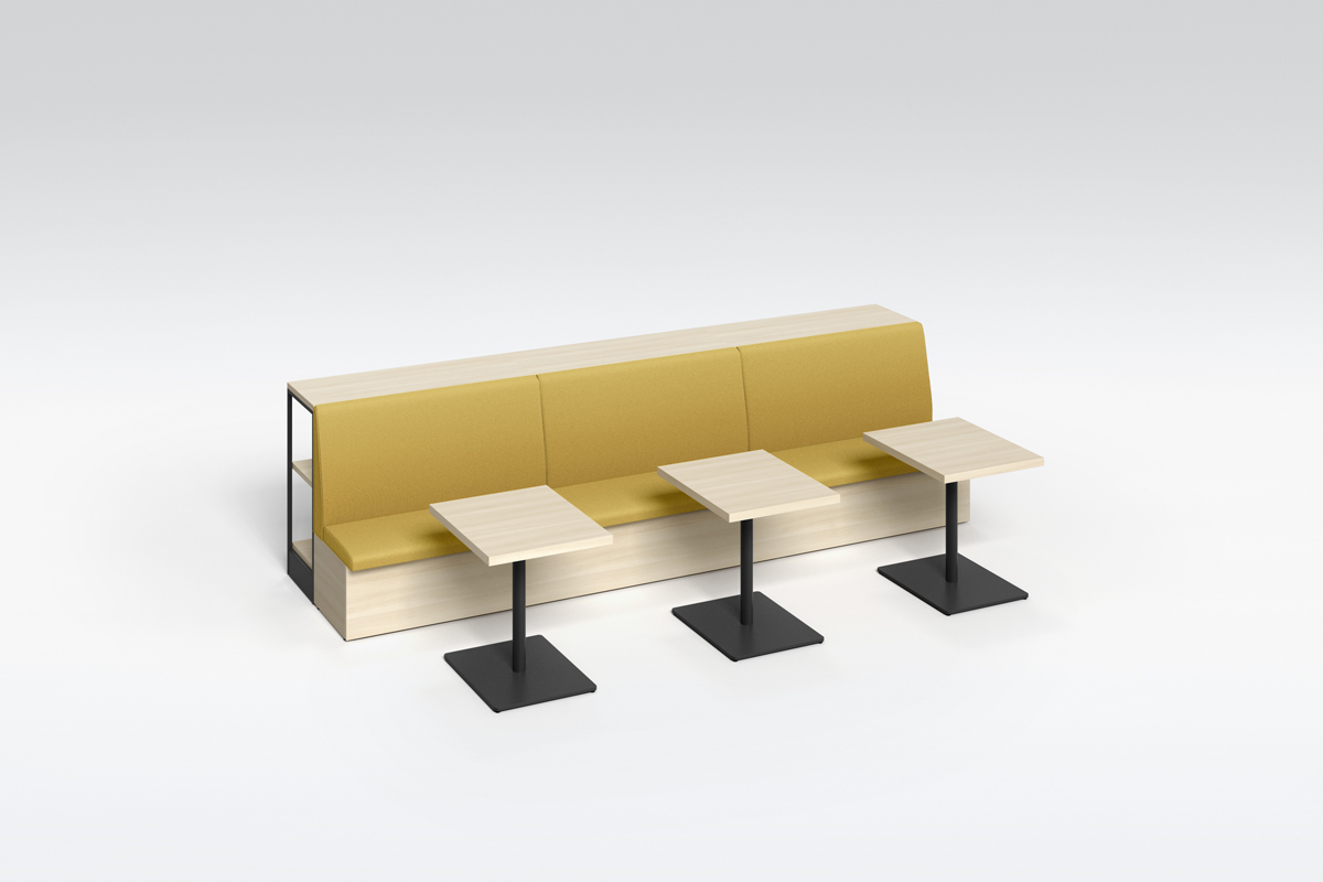 テーブルを囲むように配置することで、少人数でのミーティングが可能なレイアウト。必要に応じてソファベンチの背面にパネルやスペーサーを置くことで、周囲からの視線を遮ったり、距離をとることができます。