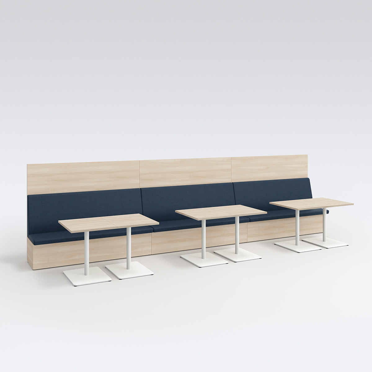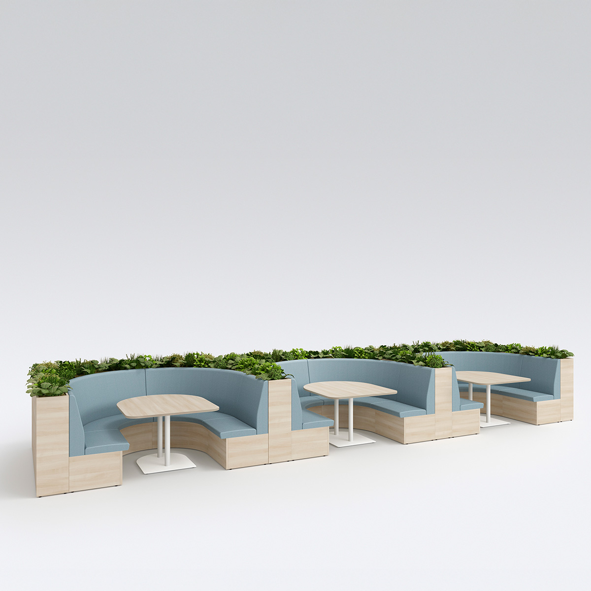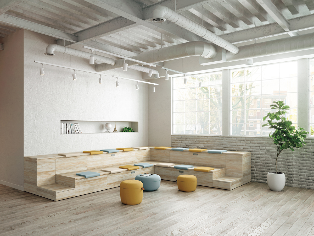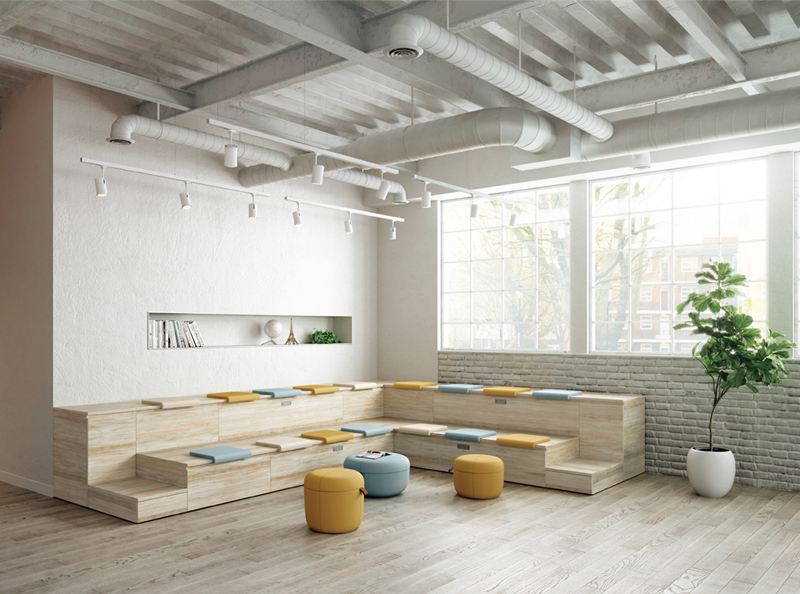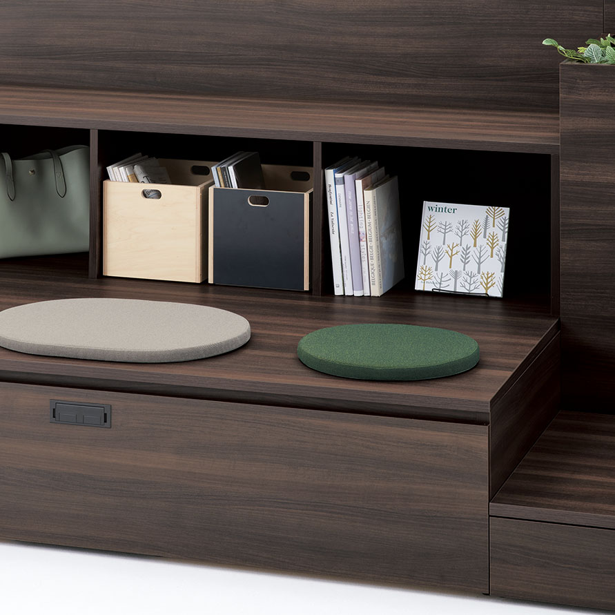 テーブルを囲むように配置することで、少人数でのミーティングが可能なレイアウト。必要に応じてソファベンチの背面にパネルやスペーサーを置くことで、周囲からの視線を遮ったり、距離をとることができます。