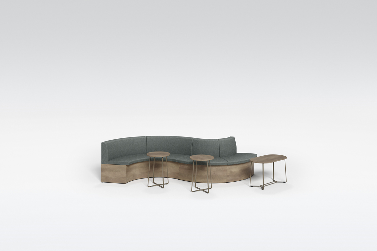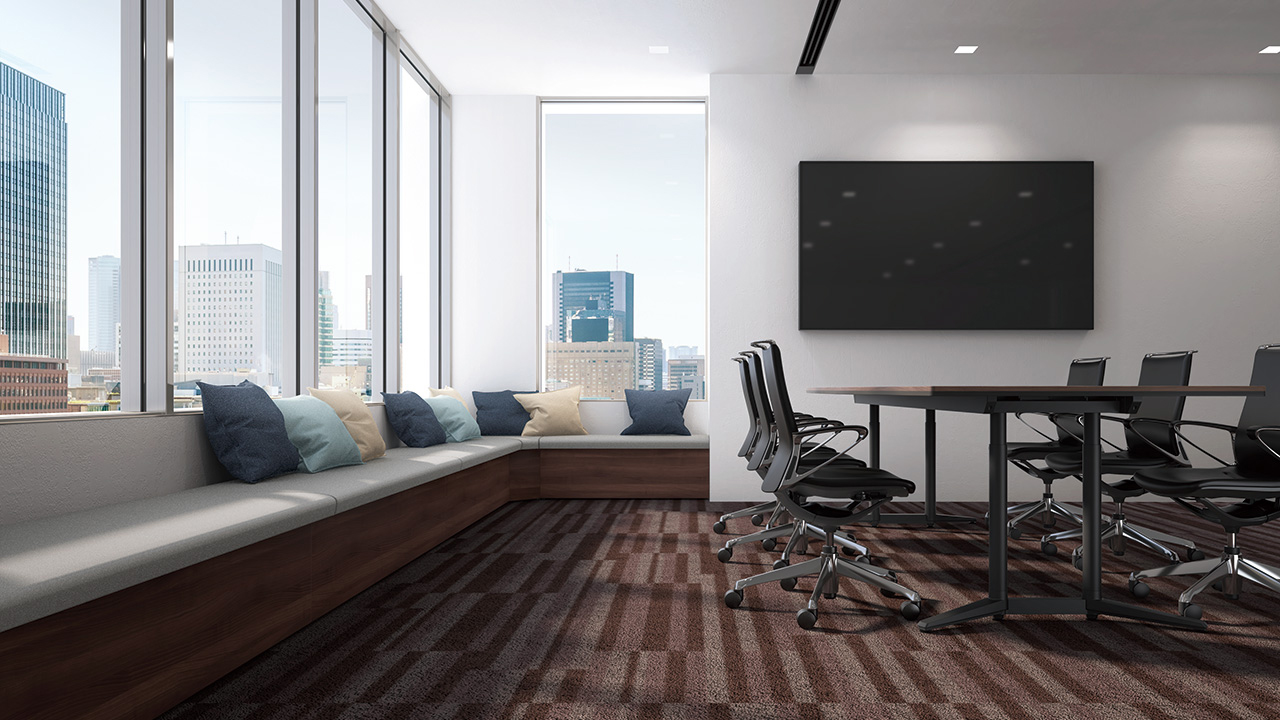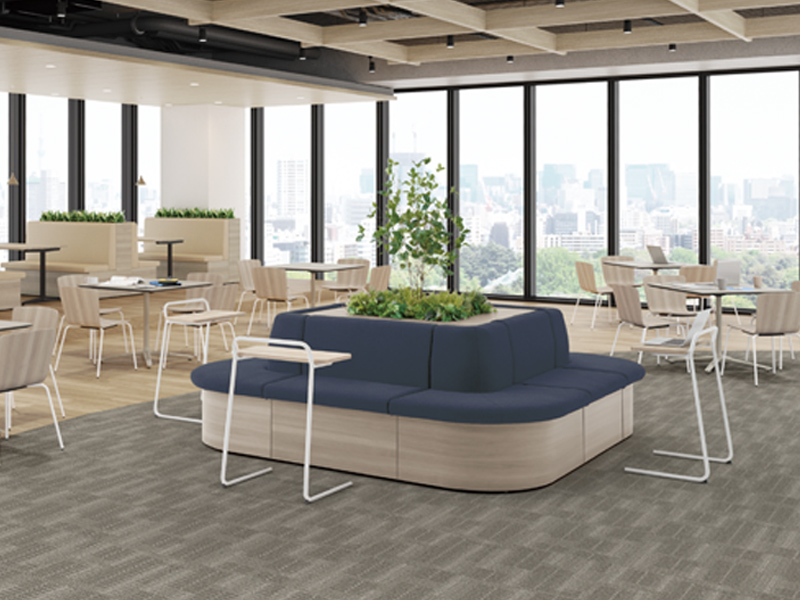 よりカジュアルなコミュニケーションに適したレイアウト。U字型のソファ形状は使用者同士の関係性を柔軟に変更でき、1on1やハイブリッド会議、ランチなど多様なシチュエーションに対応できます。