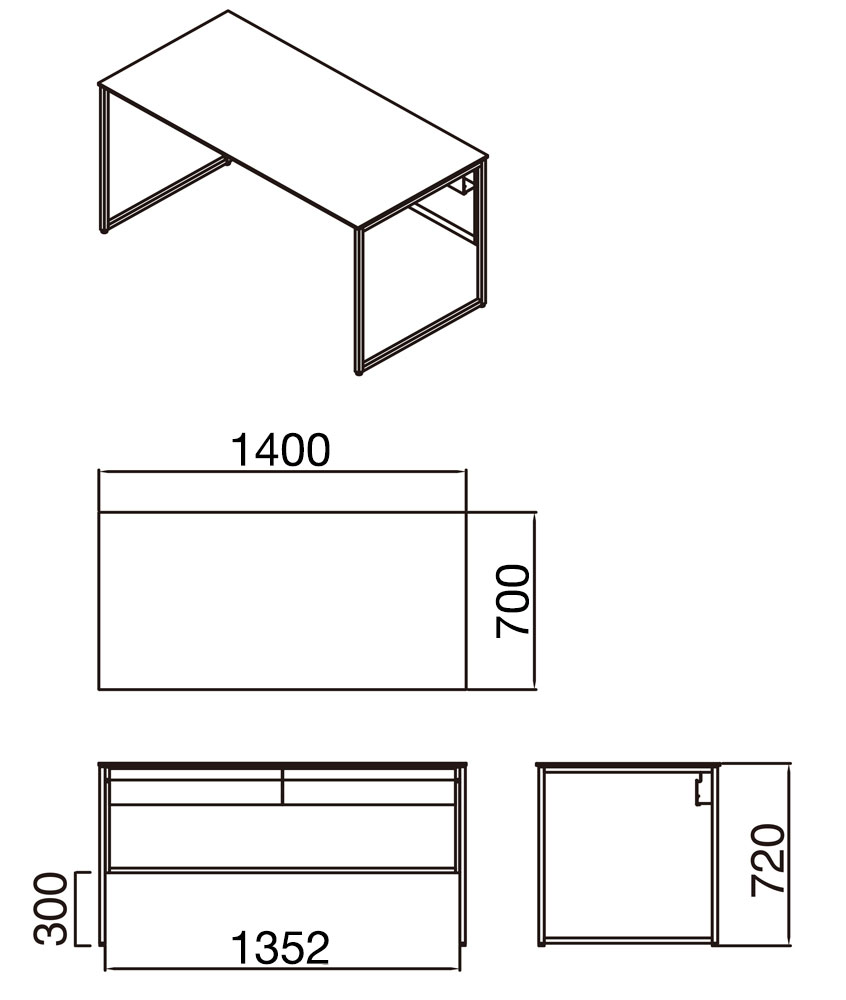 - 幅(W):1,400mm、奥行き(D):700mm、高さ(H):721mm、脚間幅:1,352mm、天板厚:15mm