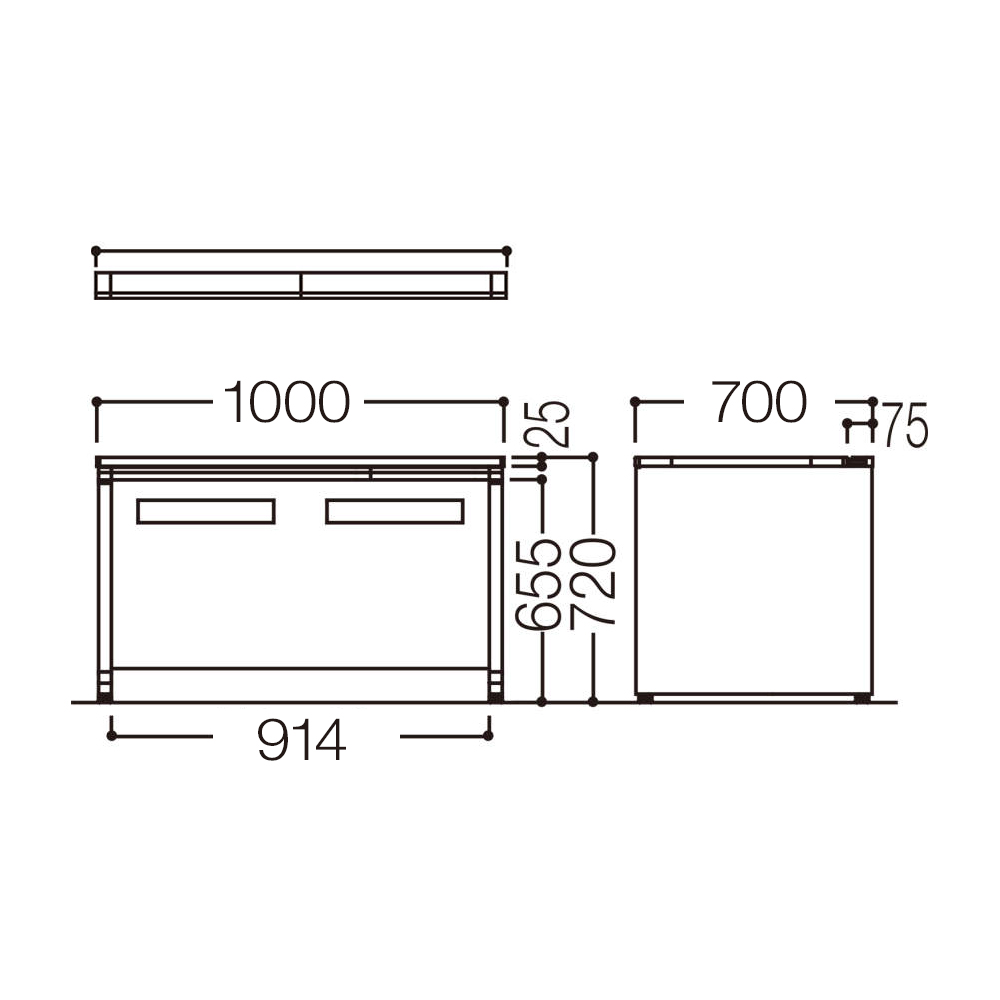- 幅(W):1,000mm、奥行き(D):700mm、高さ(H):721mm、脚間幅:914mm、天板厚:26mm