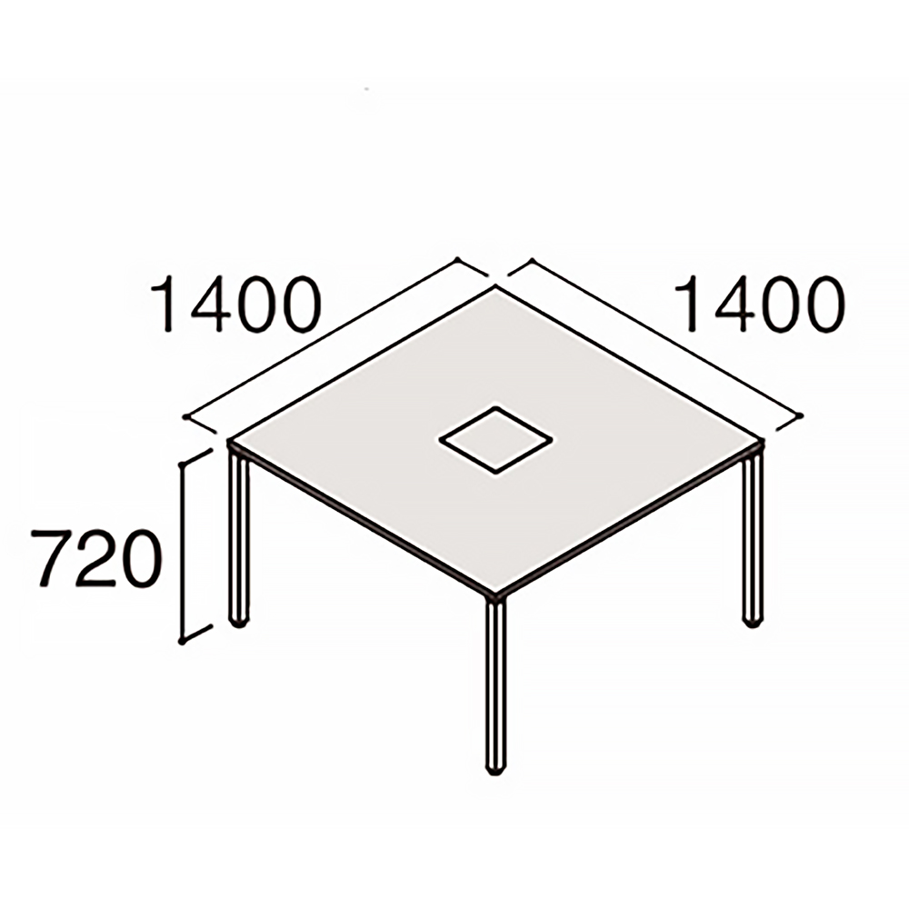- 幅(W):1,400mm、奥行き(D):1,400mm、高さ(H):720mm、脚間幅:1,310mm、天板厚:25mm