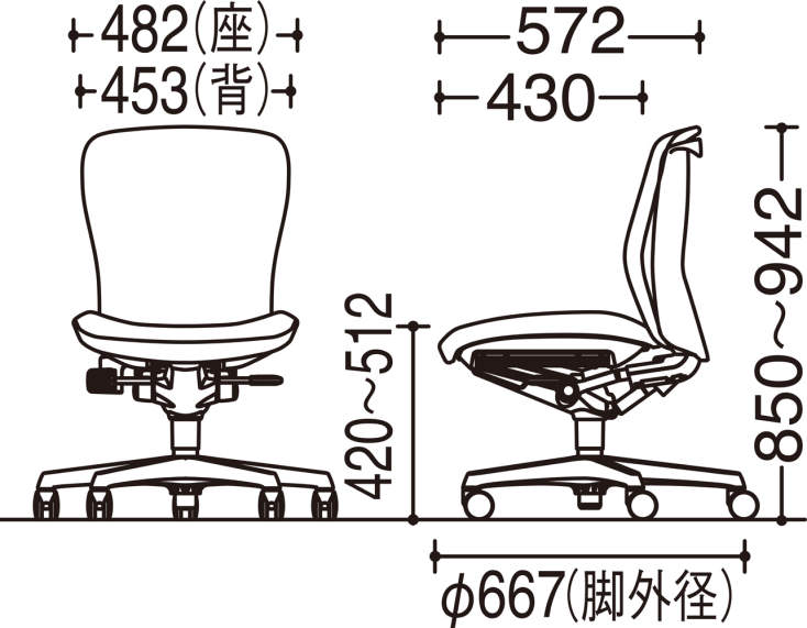 - 幅(W):667mm、奥行き(D):667mm、高さ(H):850~942mm、背幅:453mm、座面幅:482mm、座面奥行き:430mm、座面高(SH):420~512mm、脚ベース直径:667mm