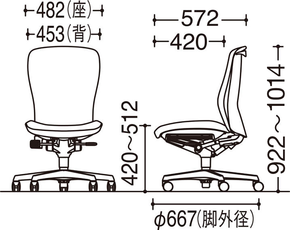 - 幅(W):667mm、奥行き(D):667mm、高さ(H):920~1,012mm、背幅:453mm、座面幅:482mm、座面奥行き:420mm、座面高(SH):420~512mm、脚ベース直径:667mm