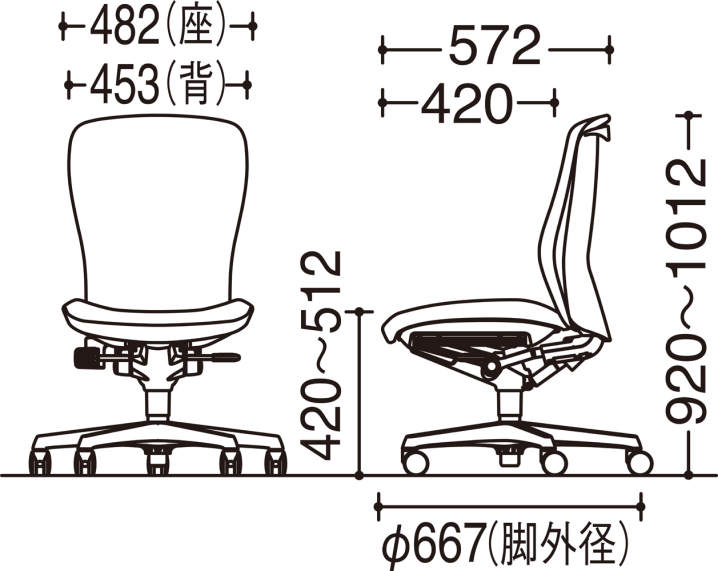 - 幅(W):667mm、奥行き(D):667mm、高さ(H):920~1,012mm、背幅:453mm、座面幅:482mm、座面奥行き:420mm、座面高(SH):420~512mm、脚ベース直径:667mm