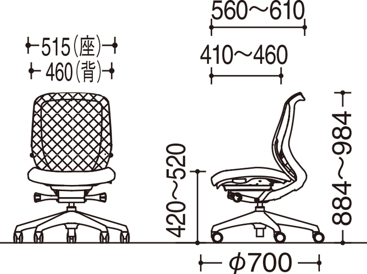 - 幅(W):515mm、奥行き(D):560mm、高さ(H):884~984mm、背幅:460mm、座面幅:515mm、座面奥行き:410~460mm、座面高(SH):420~520mm、脚ベース直径:700mm
