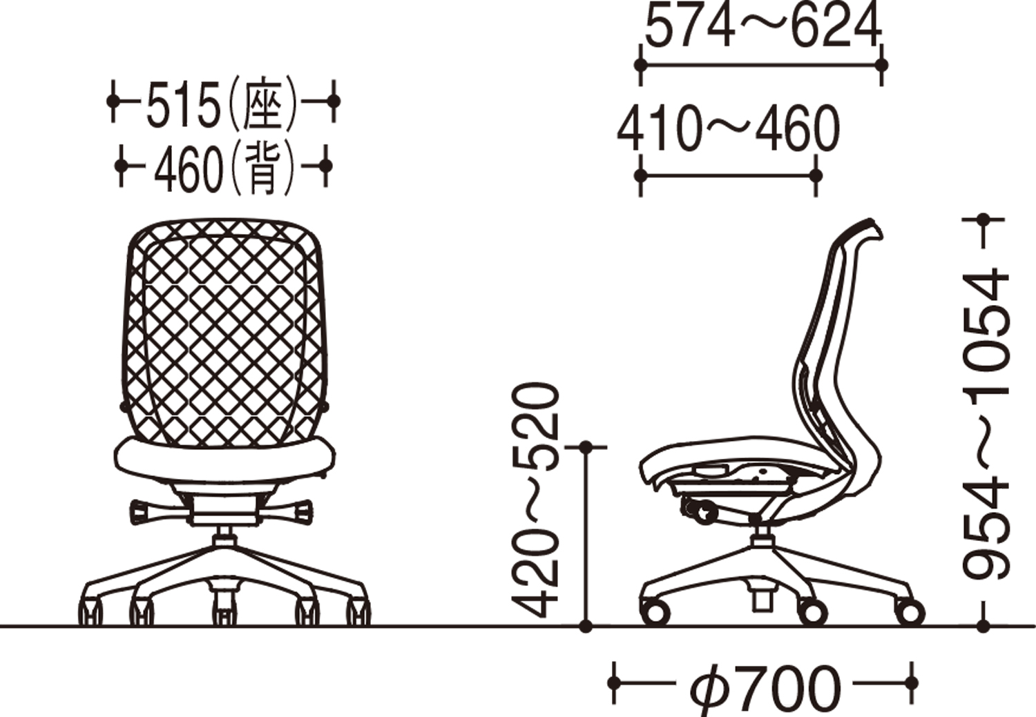 - 幅(W):515mm、奥行き(D):574mm、高さ(H):954~1,054mm、背幅:460mm、座面幅:515mm、座面奥行き:410~460mm、座面高(SH):420~520mm、脚ベース直径:700mm