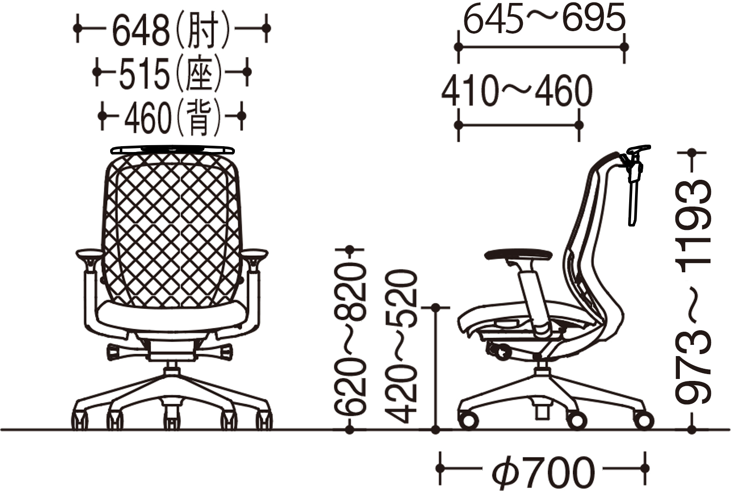 - 幅(W):700mm、奥行き(D):700mm、高さ(H):973~1,193mm、背幅:460mm、座面幅:515mm、座面奥行き:410~460mm、座面高(SH):420~520mm、アームレスト高さ:620~820mm、脚ベース直径:700mm