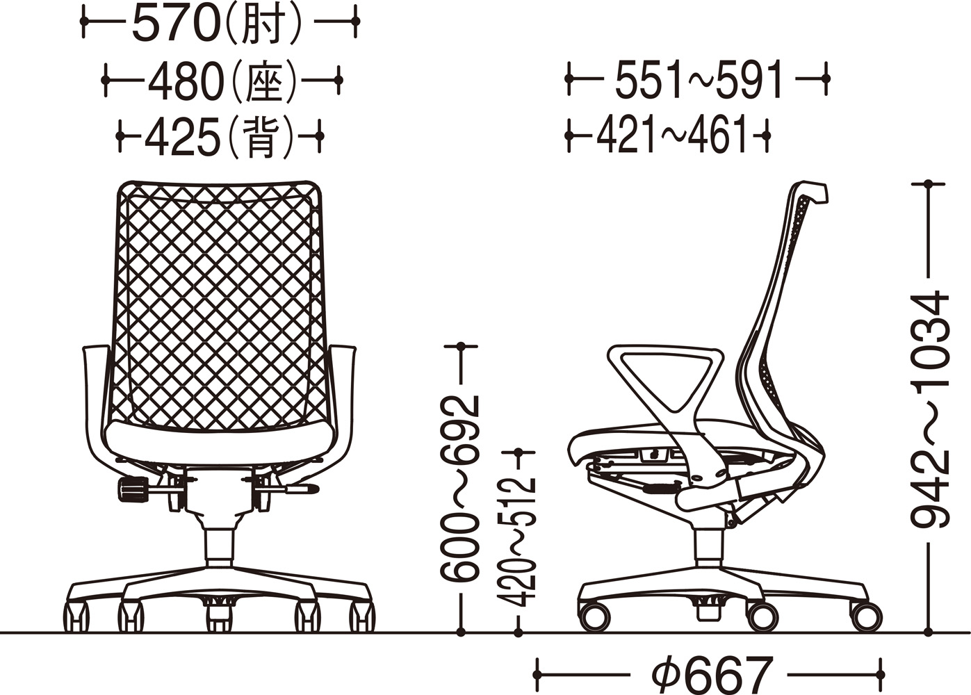 - 幅(W):667mm、奥行き(D):667mm、高さ(H):942~1,034mm、背幅:425mm、座面幅:480mm、座面奥行き:421~461mm、座面高(SH):420~512mm、アームレスト高さ:600~692mm、、脚ベース直径:667mm