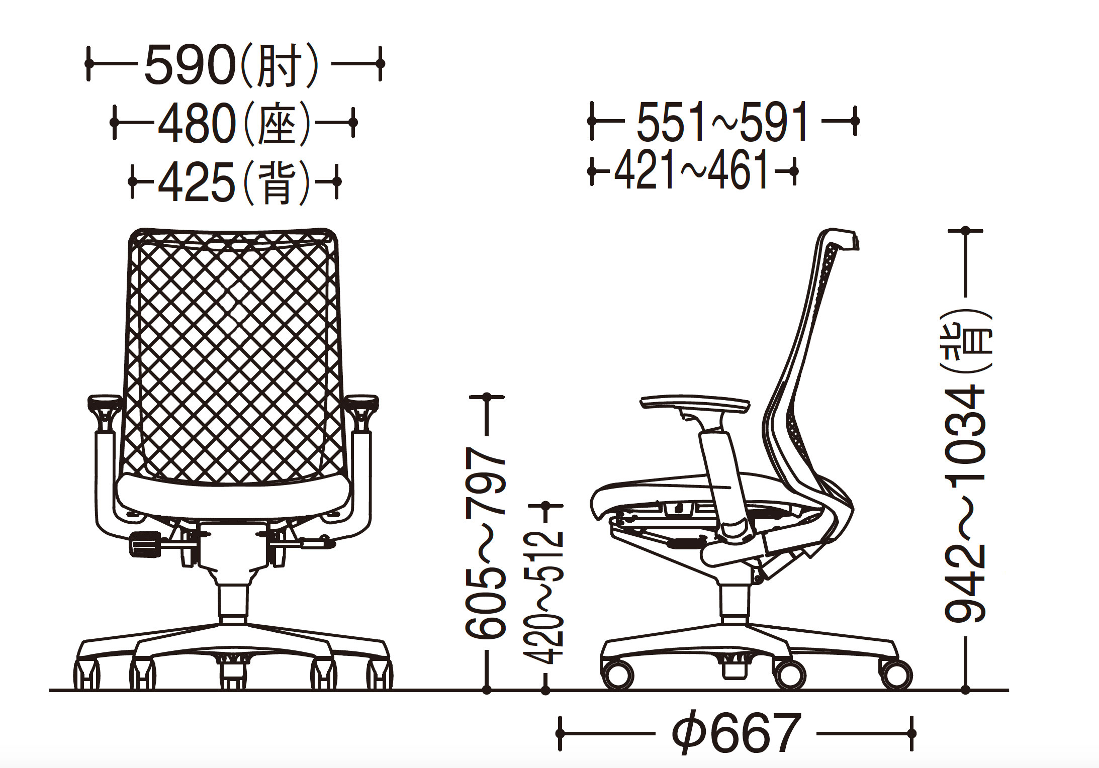 - 幅(W):590mm、奥行き(D):551mm、高さ(H):942~1,034mm、背幅:425mm、座面幅:480mm、座面奥行き:421~461mm、座面高(SH):420~512mm、アームレスト高さ:605~797mm、、脚ベース直径:667mm