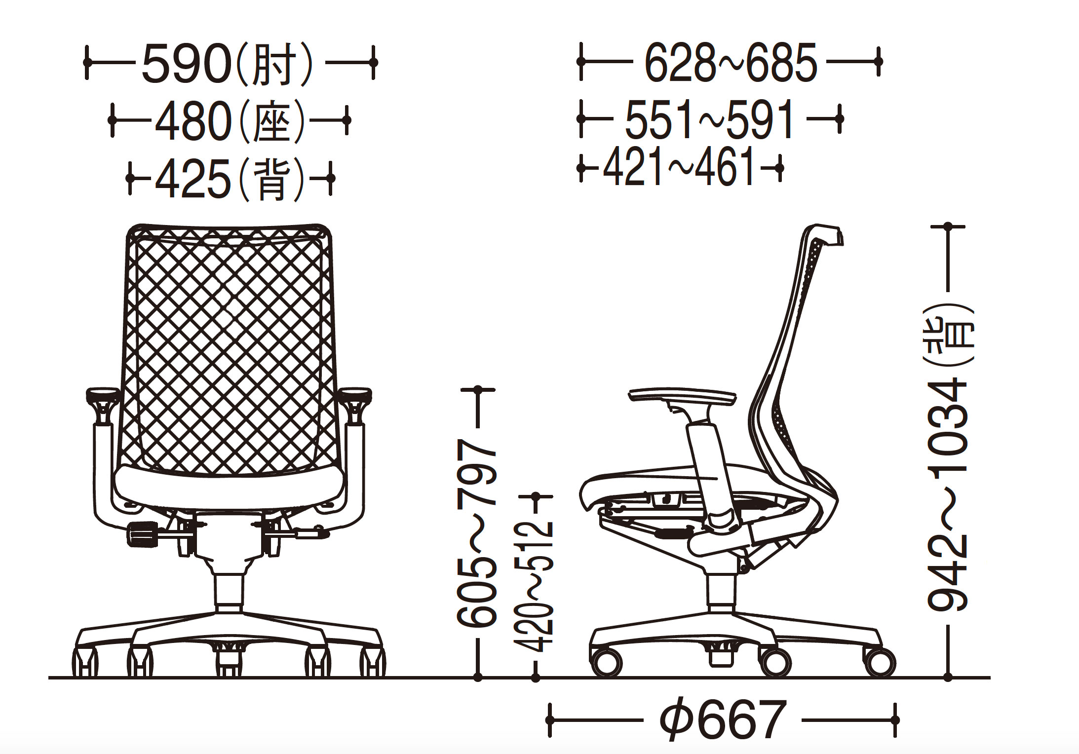 - 幅(W):667mm、奥行き(D):667mm、高さ(H):942~1,034mm、背幅:425mm、座面幅:480mm、座面奥行き:421~461mm、座面高(SH):420~512mm、アームレスト高さ:605~797mm、、脚ベース直径:667mm