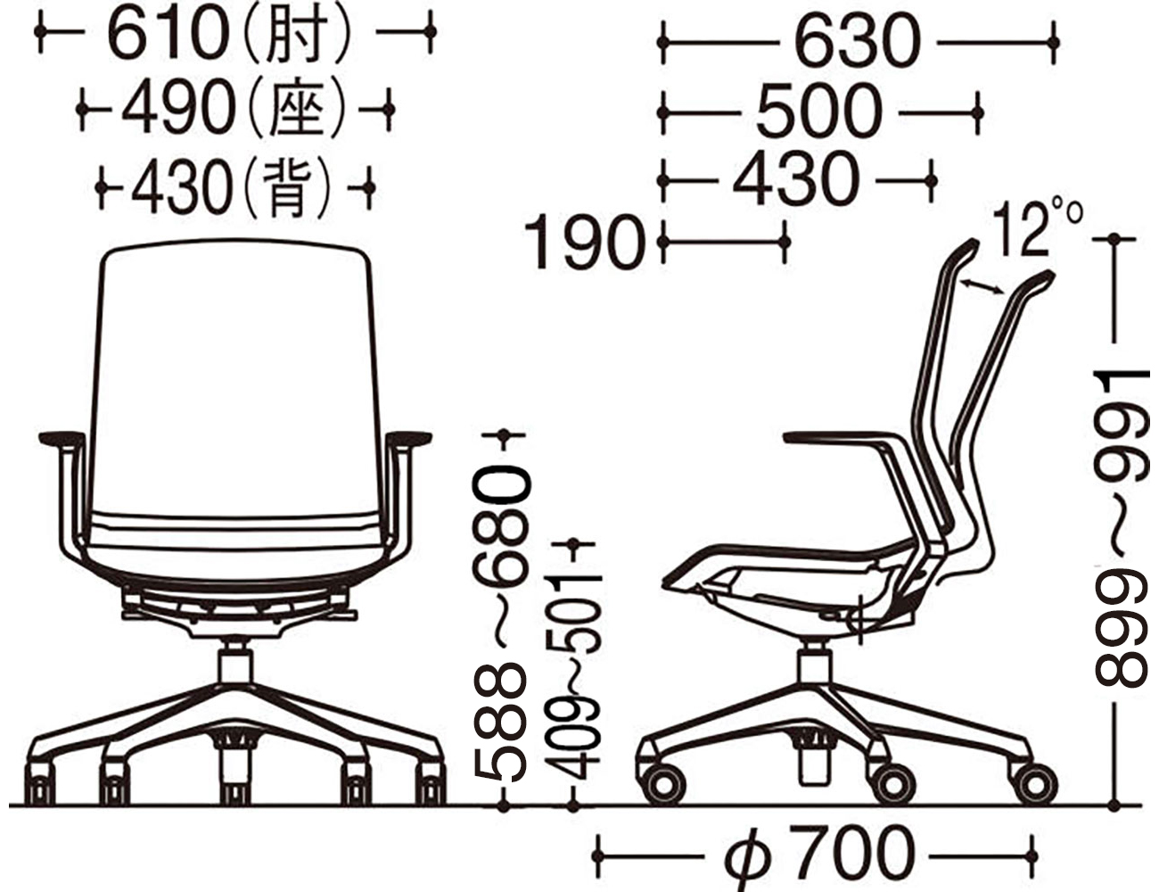 - 幅(W):700mm、奥行き(D):700mm、高さ(H):899~991mm、背幅:430mm、座面幅:490mm、座面奥行き:430mm、座面高(SH):409~501mm、アームレスト高さ:588~680mm、脚ベース直径:700mm