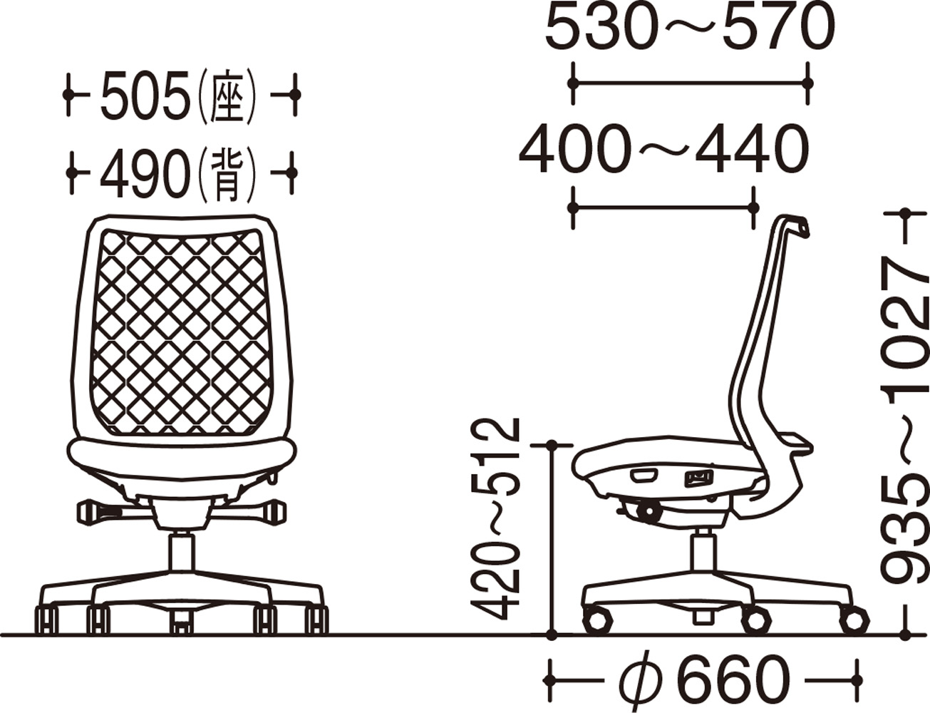 - 幅(W):660mm、奥行き(D):660mm、高さ(H):935~1,027mm、背幅:490mm、座面幅:505mm、座面奥行き:400~440mm、座面高(SH):420~512mm、脚ベース直径:660mm