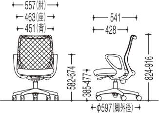 - 幅(W):557mm、奥行き(D):541mm、高さ(H):824~916mm、背幅:451mm、座面幅:463mm、座面奥行き:428mm、座面高(SH):385~477mm、アームレスト高さ:582~674mm、脚ベース直径:597mm