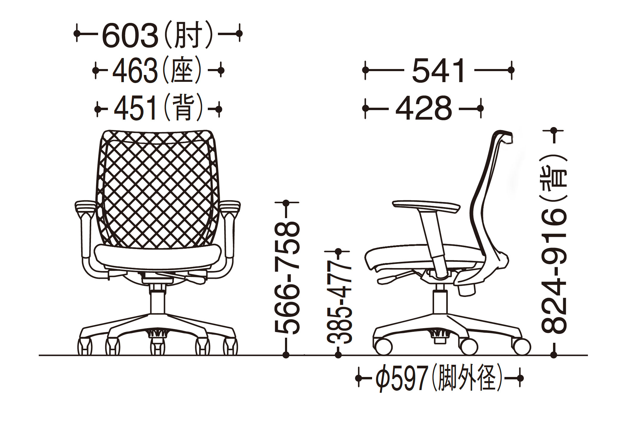- 幅(W):603mm、奥行き(D):541mm、高さ(H):824~916mm、背幅:451mm、座面幅:463mm、座面奥行き:428mm、座面高(SH):385~477mm、アームレスト高さ:566~758mm、脚ベース直径:597mm