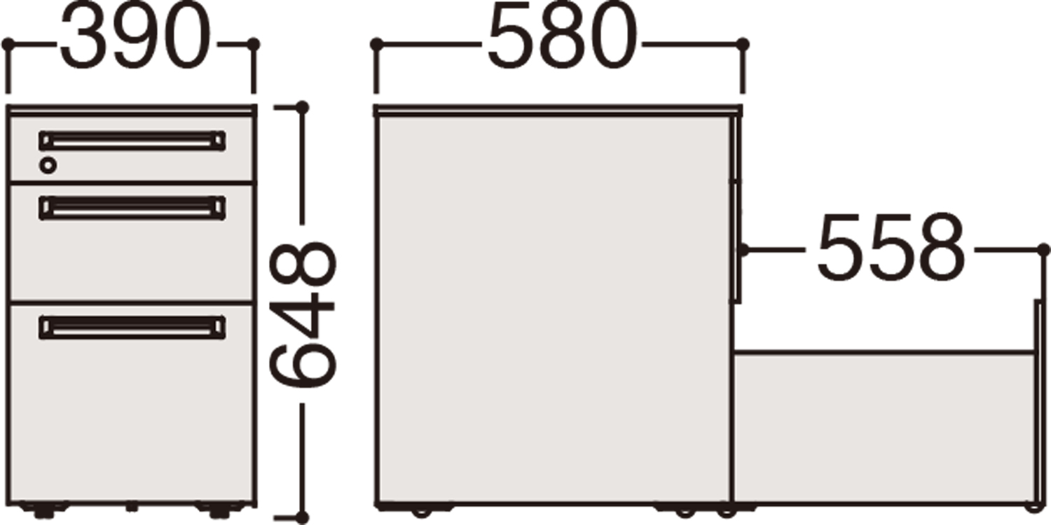- 上段:ペントレー引き出し・中段・下段:ファイル引き出しA4用