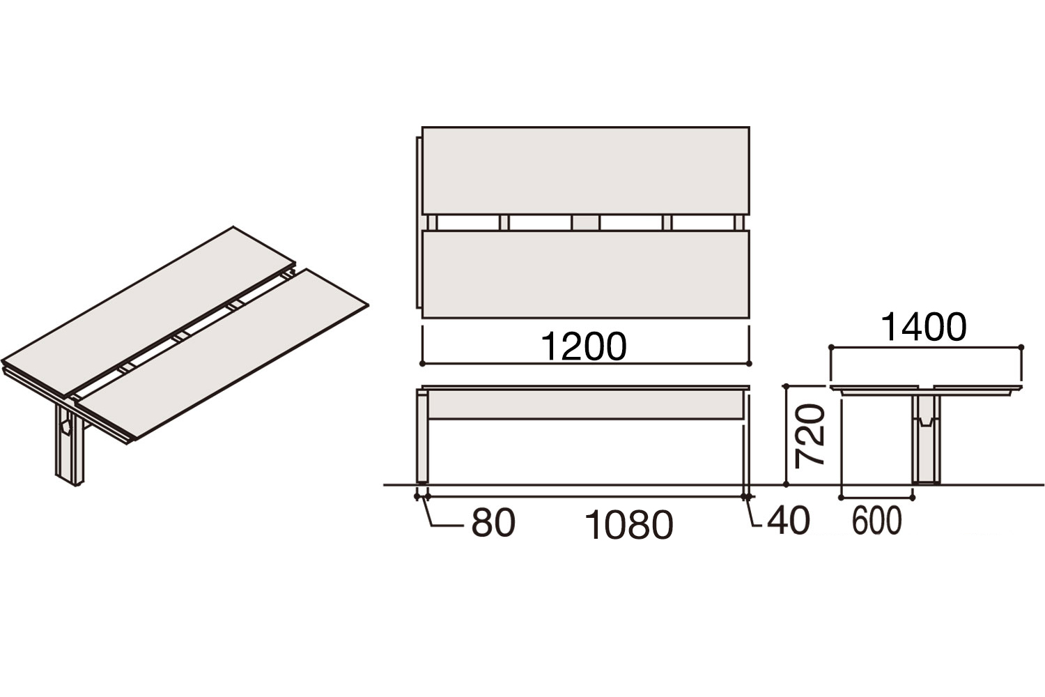 - 幅(W):1,200mm、奥行き(D):1,400mm、高さ(H):721mm、脚間幅:1,120mm、天板厚:26mm