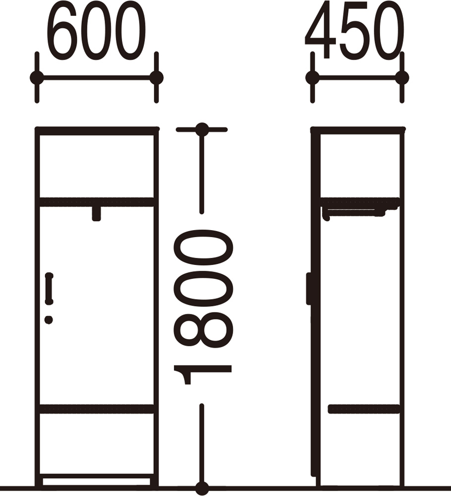 - 幅(W):600mm、奥行き(D):450mm、高さ(H):1,800mm