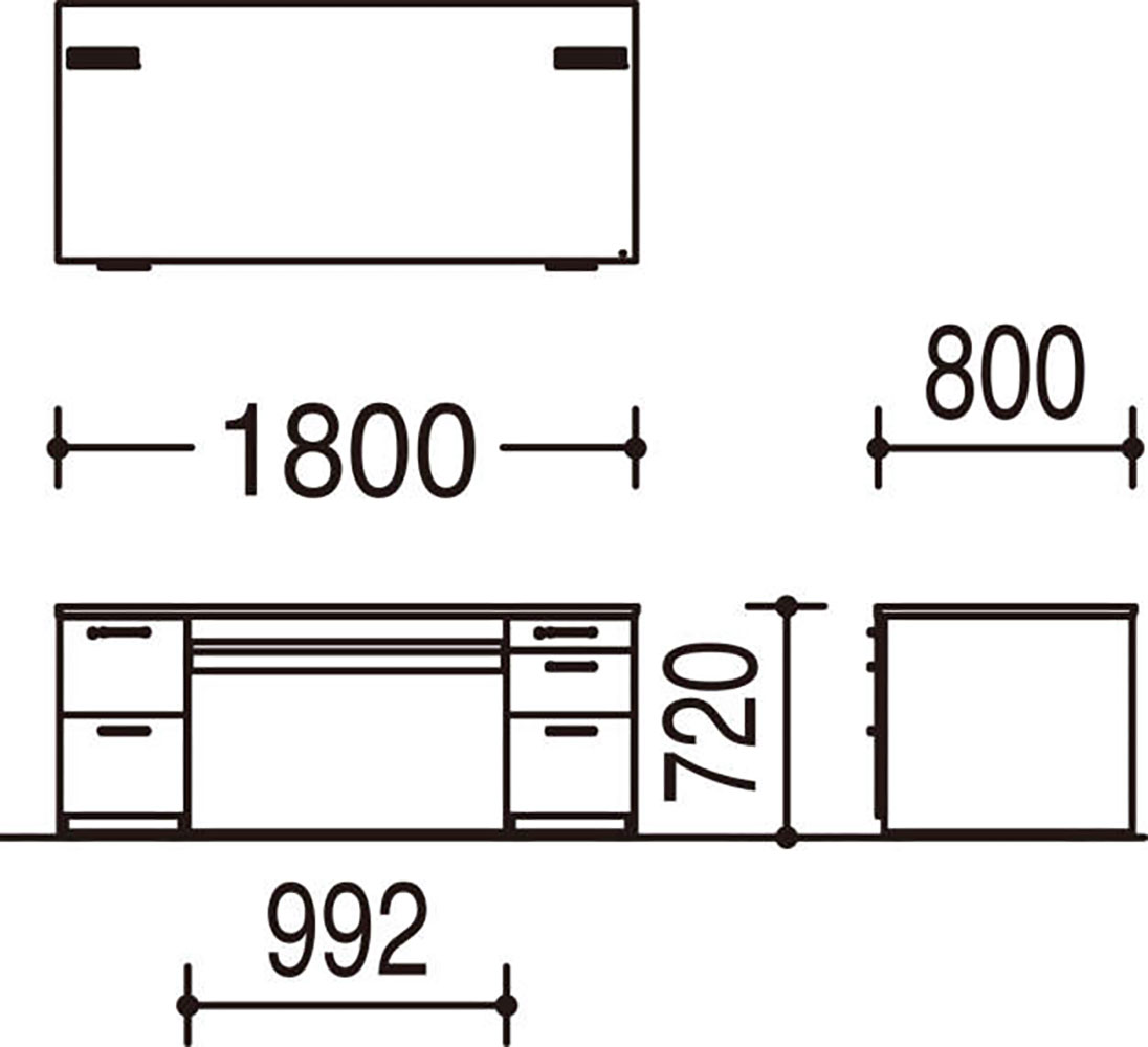 - 幅(W):1,800mm、奥行き(D):800mm、高さ(H):720mm、脚間幅:992mm、天板厚:30mm