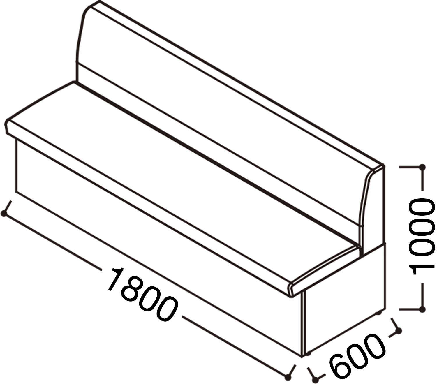 - 幅(W):1,800mm、奥行き(D):600mm、高さ(H):1,000mm、座面奥行き:450mm、座面高(SH):450mm